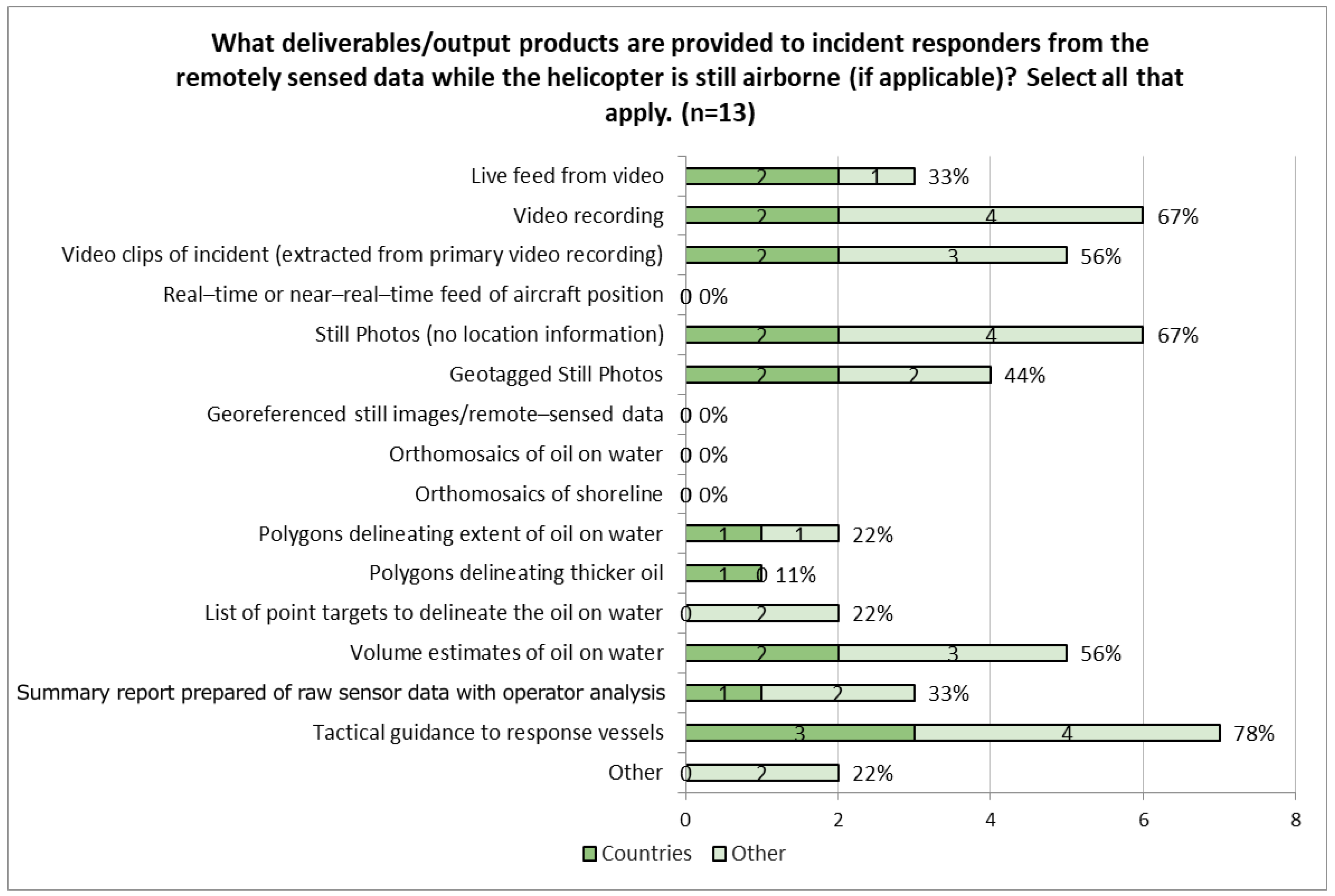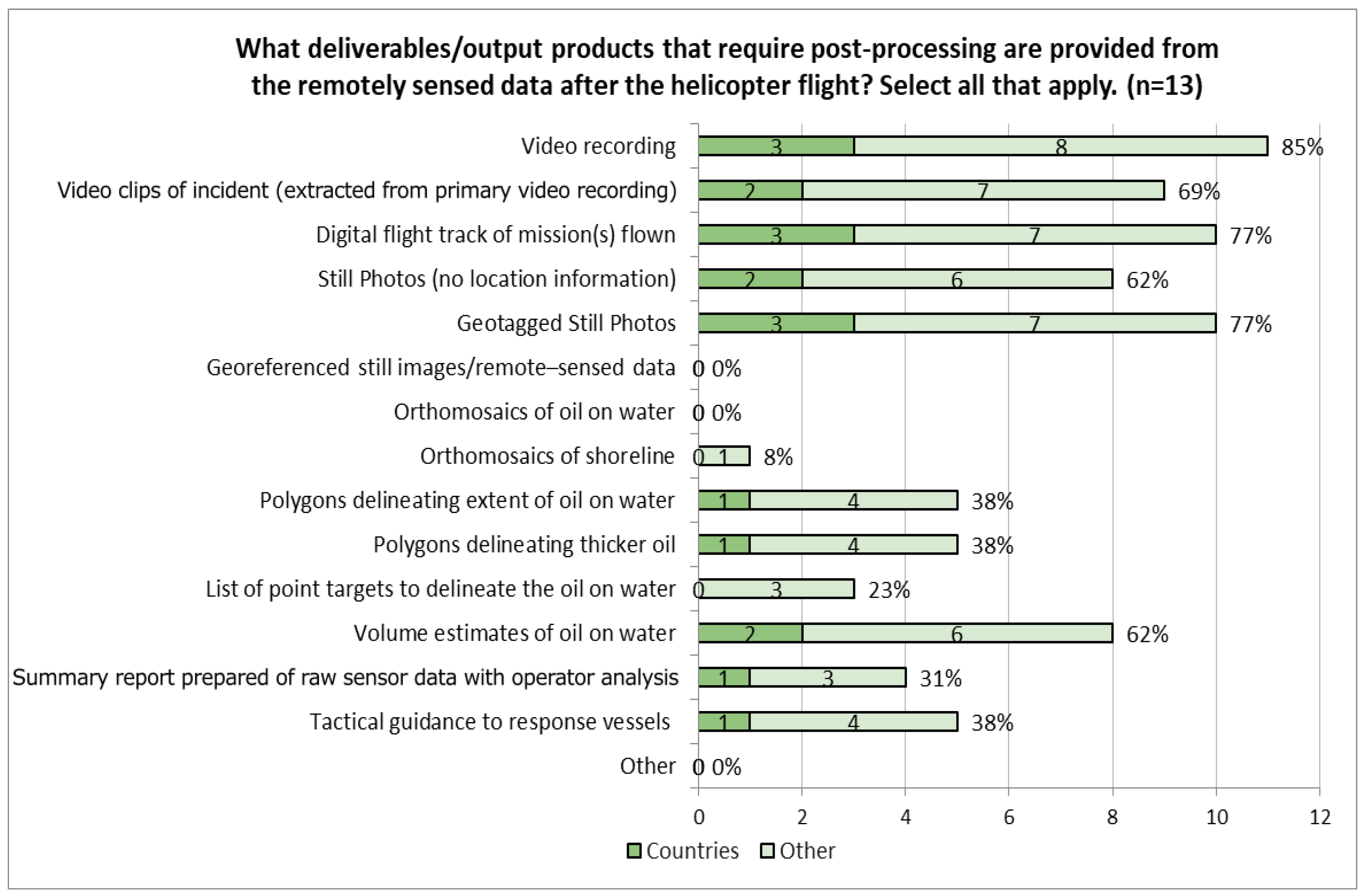 Figure 8). Five organizations also stated that surface oil volumes are provided while airborne (38%). Deliverables/Output products provided by helicopters post-flight include: “Video recordings” (85%) and “Video clips of incident extracted from primary video recording” (69%), “Digital flight track of mission(s) flown” (77%), “Geotagged still photos” (77%), and “Still Photos (no location information)” (62%), as well as “Volume estimates of oil on water” (62%) (