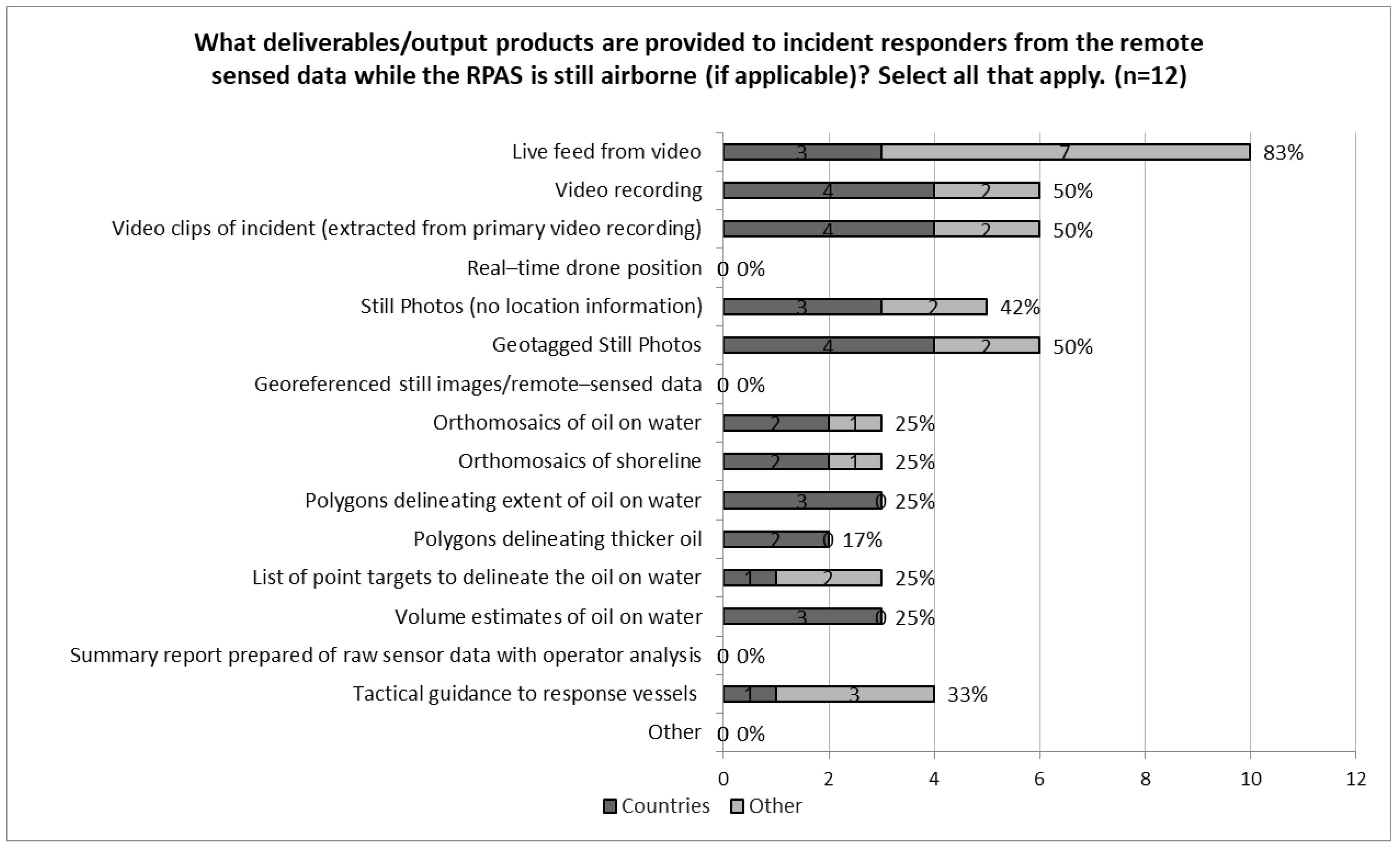 Figure 12). For real-time or near-real-time deliverables, the predominant deliverable is “Live feed from the video of the RPAS” (83%) and “Real-time drone position” (58%). Other deliverables provided by many organizations include: “Video recordings” (50%) and “Video clips of the incident extracted from the primary video recording” (50%), as well as “Geotagged still photos” (50%) and non-geotagged still images (42%). Four groups (33%) are providing “Tactical support to response vessels in real-time” from RPASs while three (25%) groups are providing real-time spill volume estimates, although no details were provided on how this is conducted.