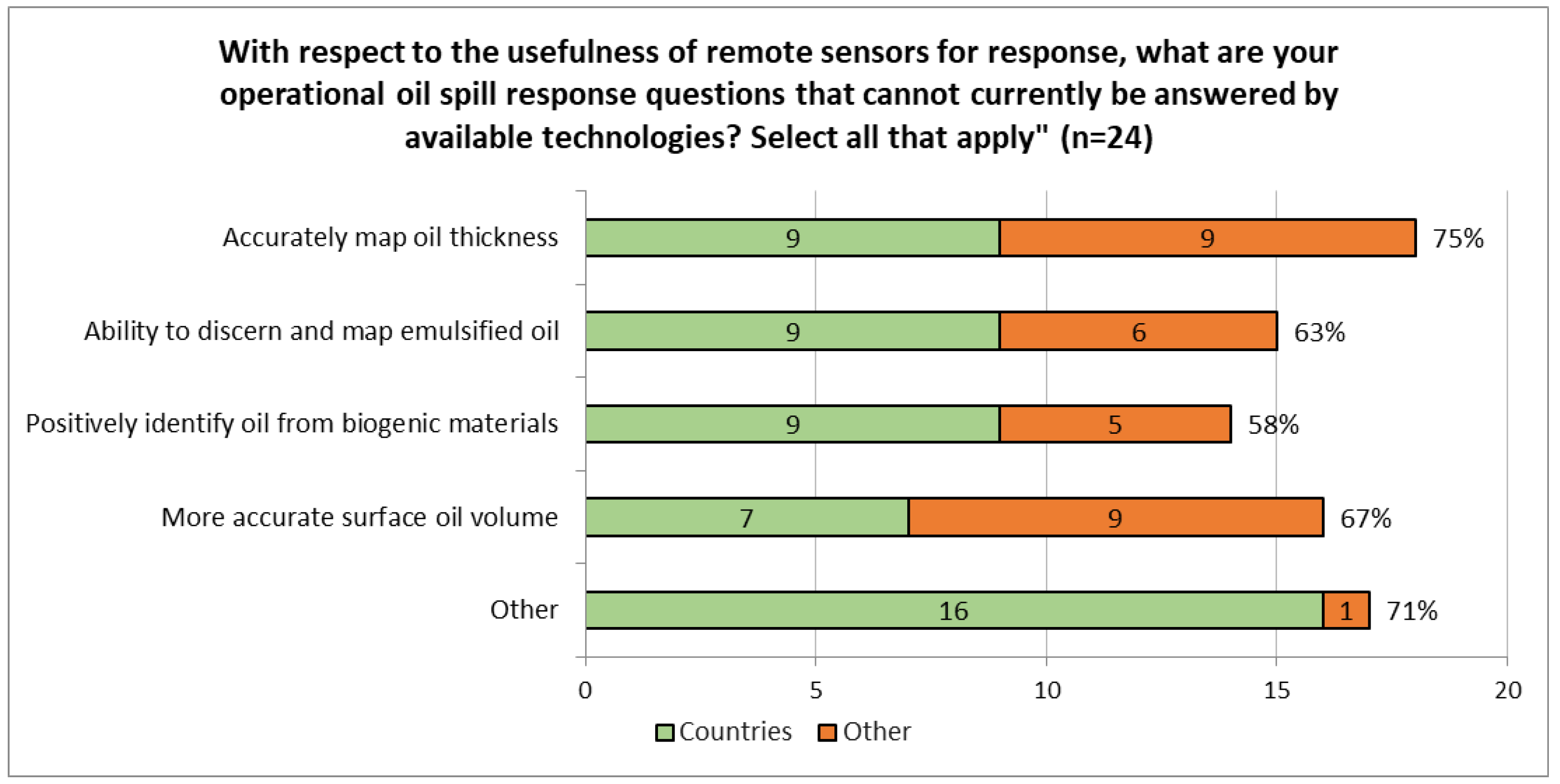 A number of possible questions were provided in the questionnaire that respondents could multi-select. They could also provide “other” questions that have shortcomings from available technologies. “Accurately mapping oil thickness” (75%) and “More accurate surface oil volume” (67%) have the most responses, followed by “Ability to discern and map emulsified oil” (63%) and “Positively identifying oil from biogenic materials” (58%) (