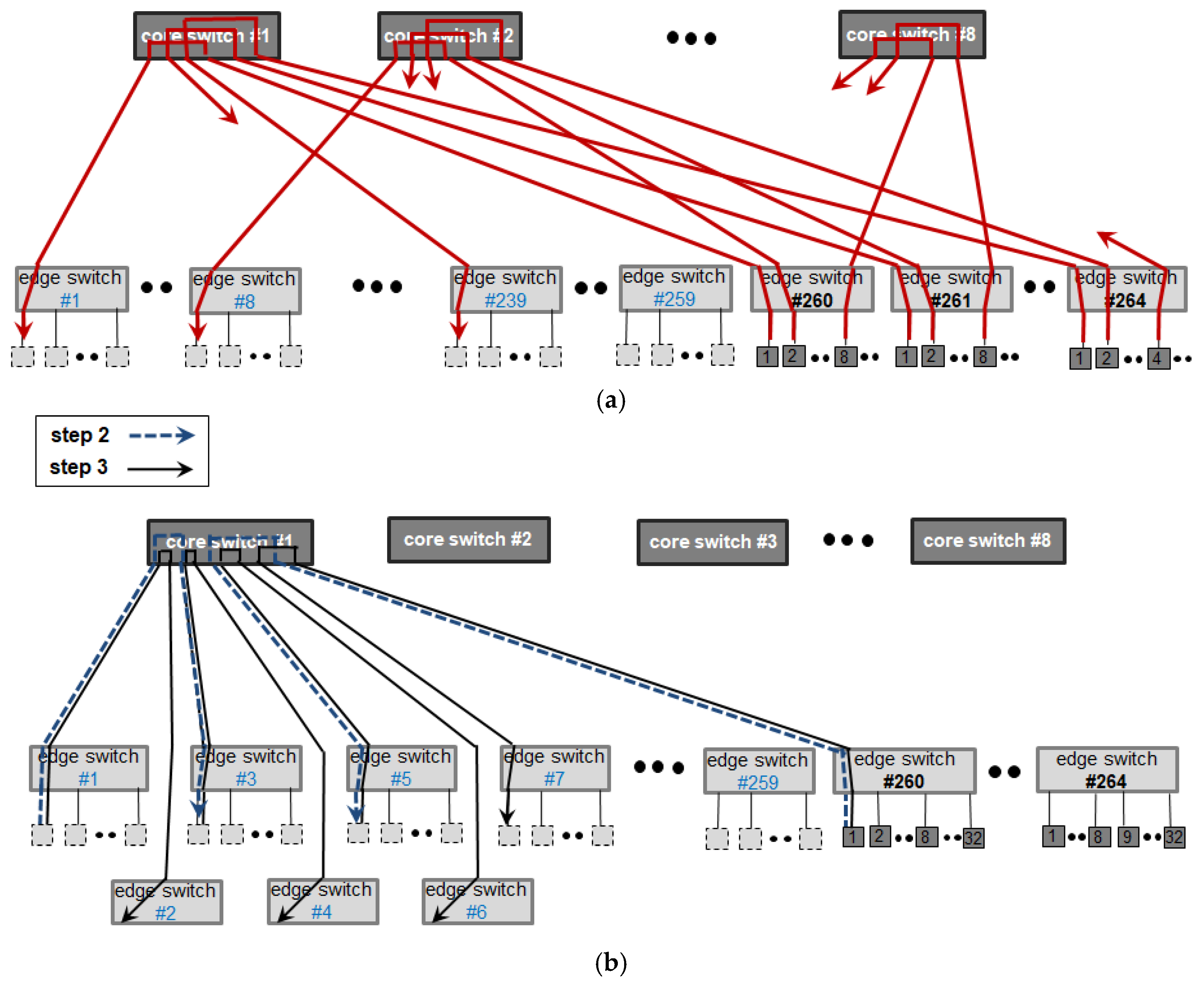 - Jain, N.; Bhatele, A.; Howell, L.; Böhme, D.; Karlin, I.; León, E.A. Predicting the Performance Impact of Different Fat-Tree Configurations. In Proceedings of the International Conference for High Performance Computing, Networking, Storage and Analysis, Denver, CO, USA, 12–17 November 2017; pp. 1–13. [Google Scholar]