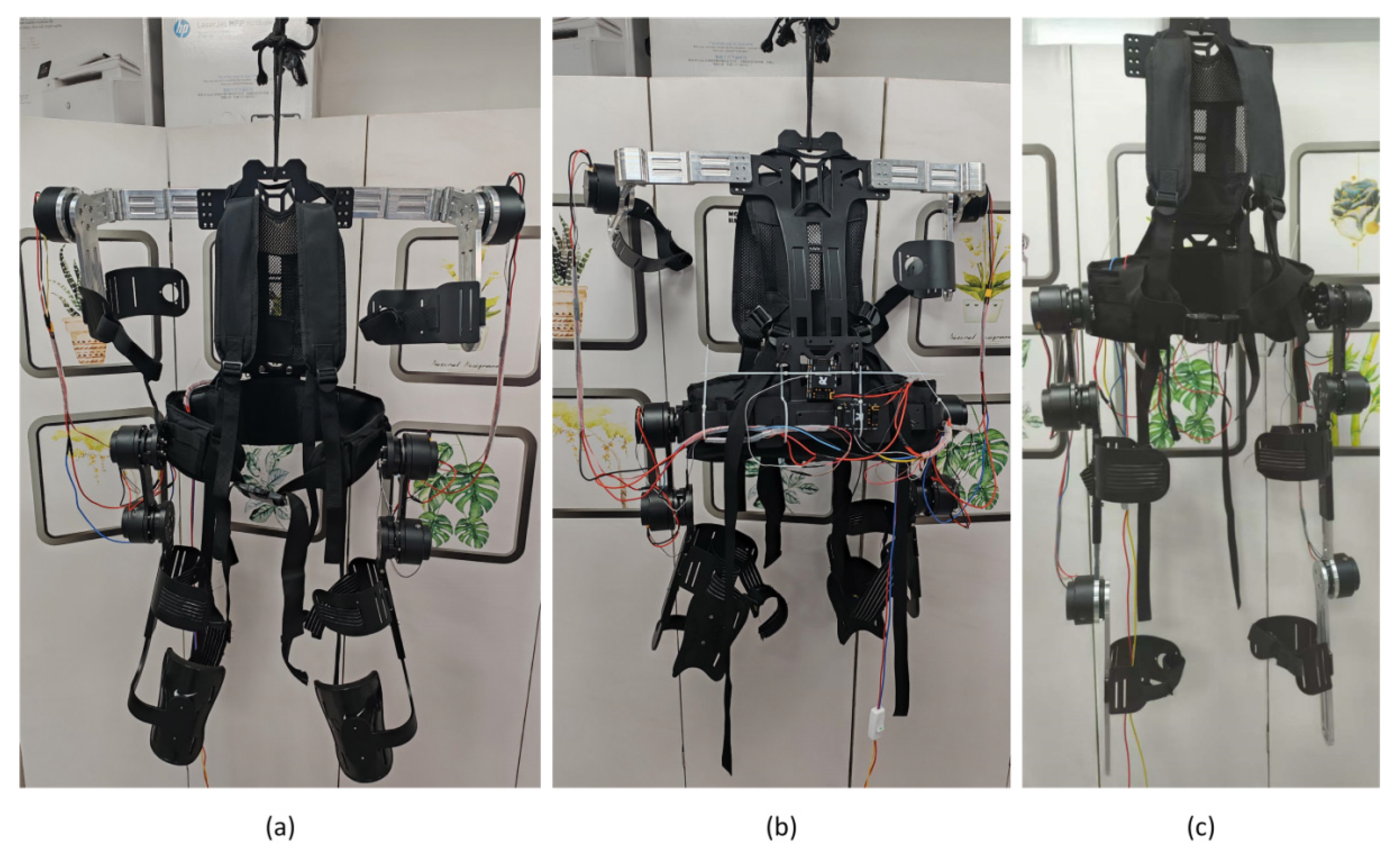 Figure 2a,b. It features three motor-driven joints at the shoulders, waist and hips. These joints have a range of motion that is engineered to accommodate normal human activities, including squatting, walking, and running. The hip-knee exoskeleton weighs approximately 8 kg in total and features three motor-driven joints at the waist, hip and knee.The hip-knee exoskeleton is shown in