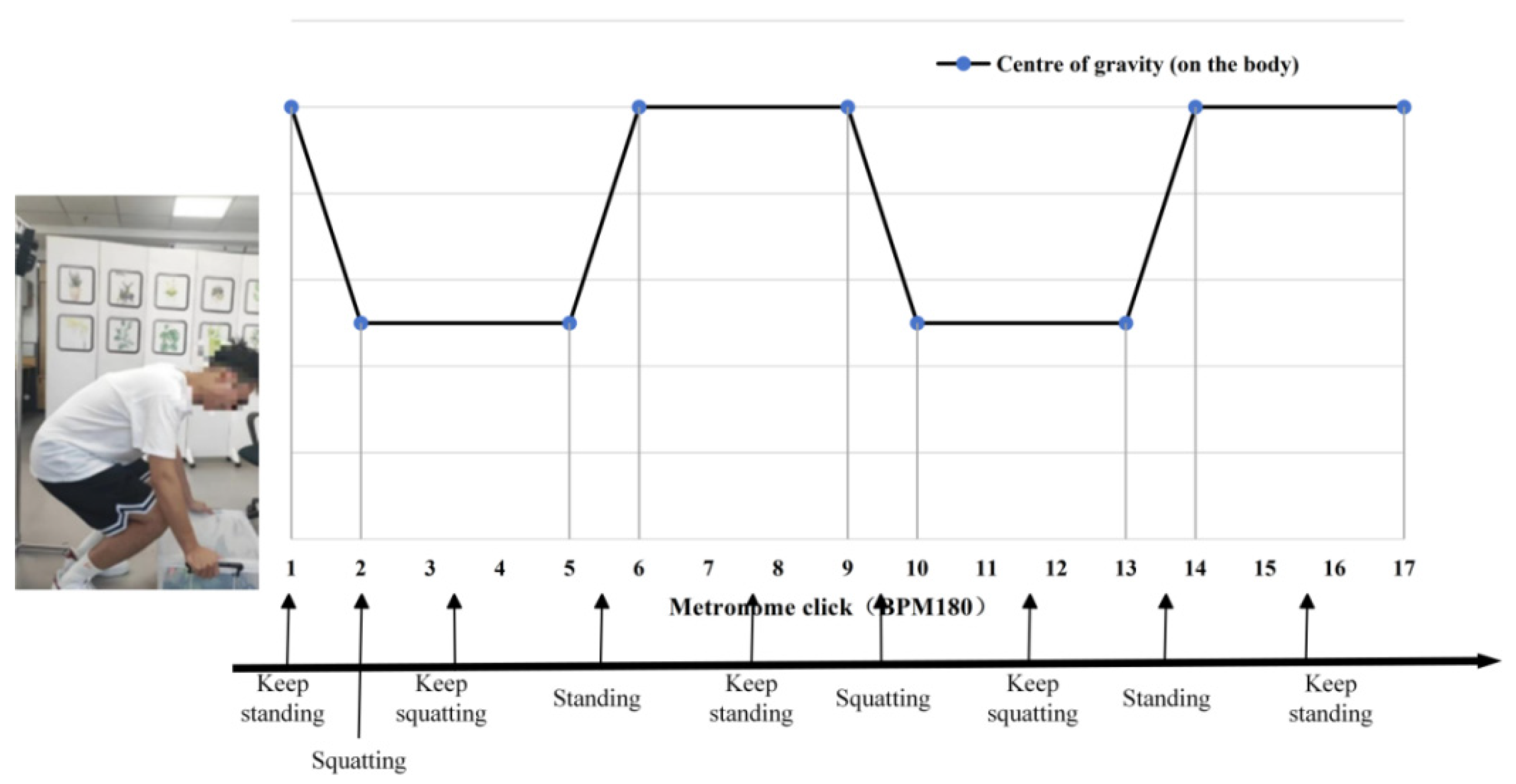 The experimenter initiates the procedure by assuming a squat position to retrieve a 10 kg weight from the ground. Thereafter, they stand up straight and repeat the squat movement. In this process, it is imperative for the experimenter to maintain an upright posture to mitigate potential lumbar injury from the weight of the heavy object. This process is repeated until the experimenter reaches a state of fatigue. The experimenter performs the handling test in accordance with the metronome rhythm of 180 beats per minute (BPM). The metronome sounds every four times for the experimenter to complete a movement, as shown in
