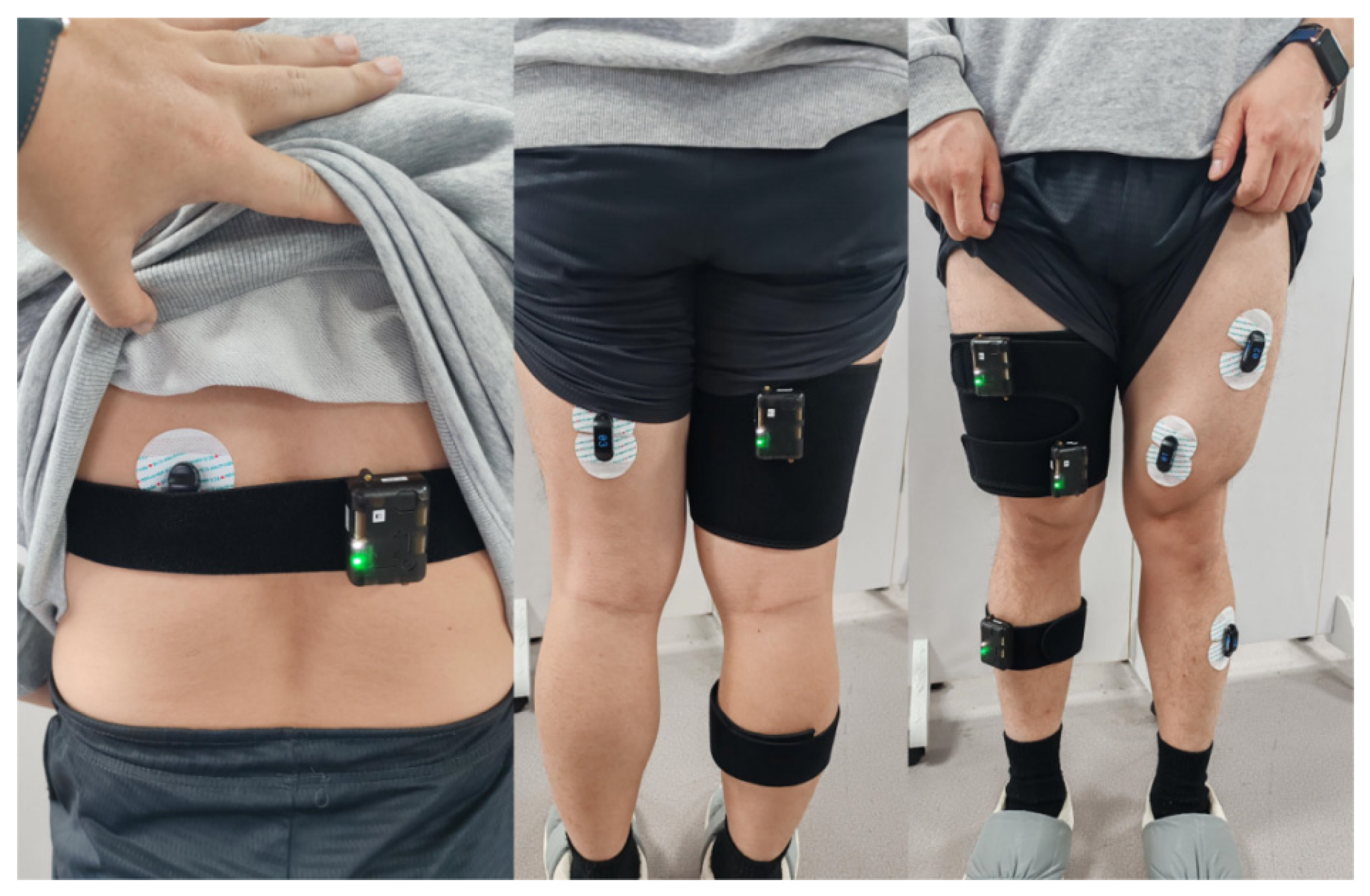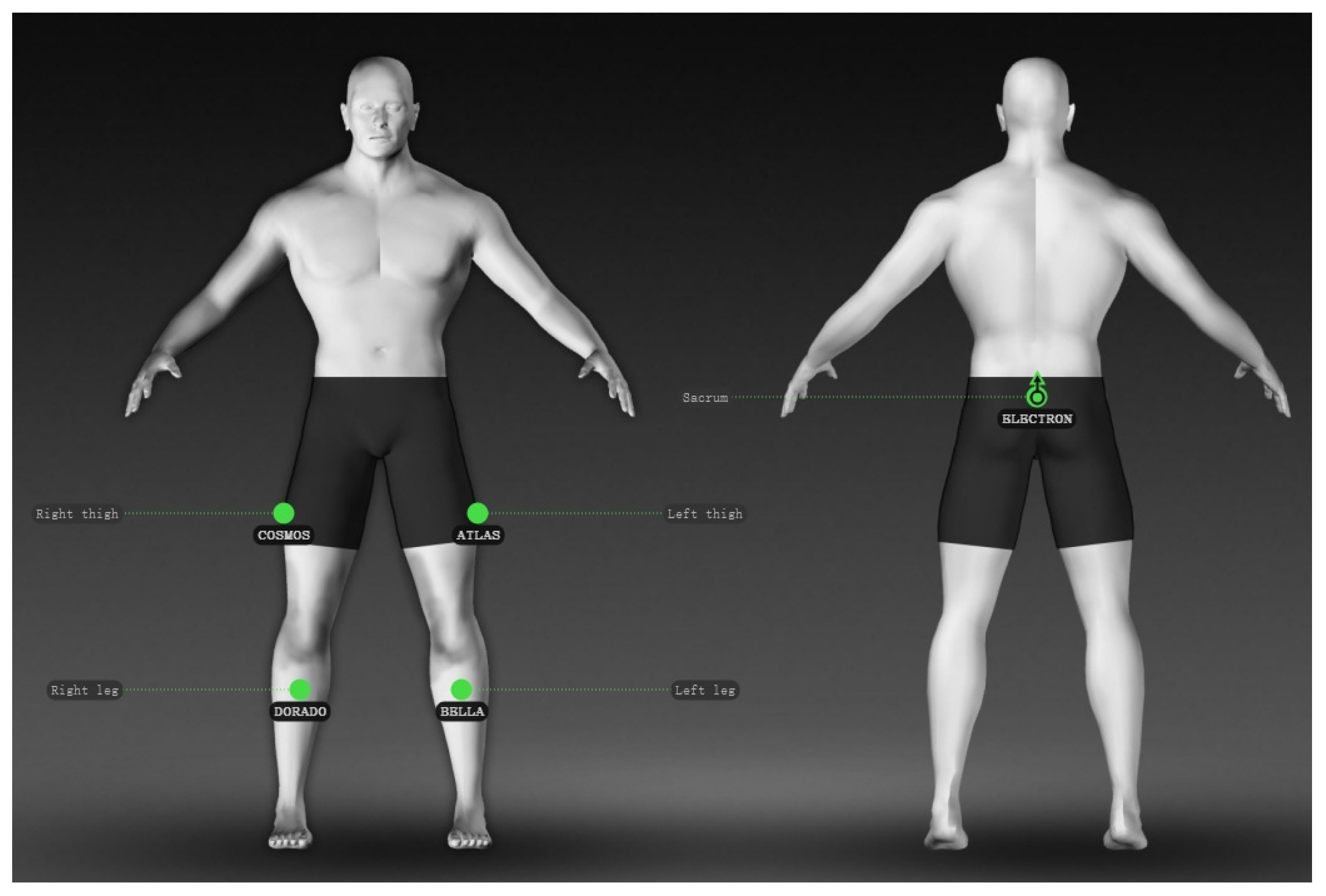 Figure 4. One sensor was placed in the posterior lumbar position for localisation, and four sensors were placed bilaterally on the thighs and calves to collect IMU signals during exercise. The transmission of all coordinate data was facilitated wirelessly to the host computer via a wireless acquisition box.