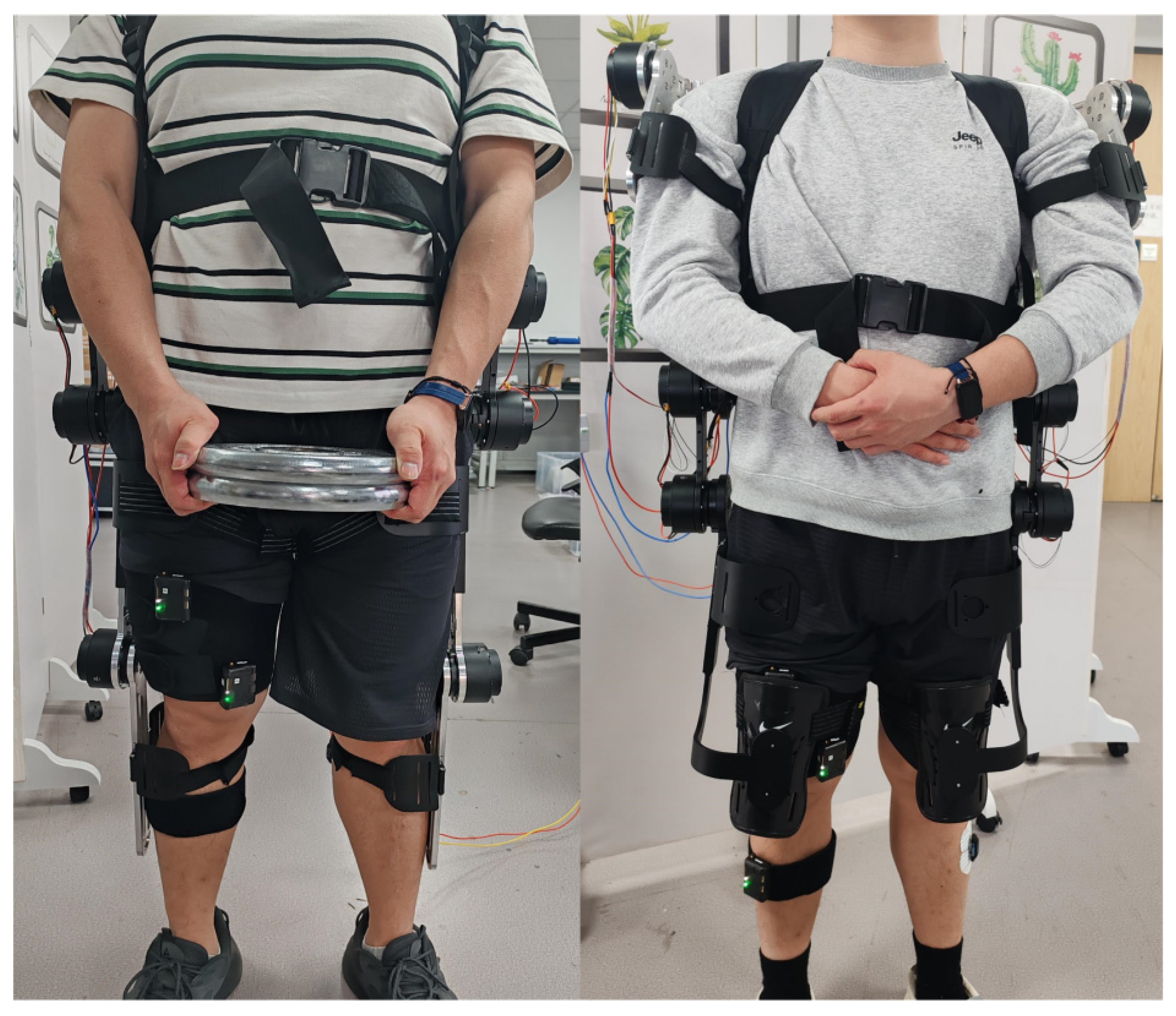 The core differences between the two exoskeleton prototypes lie in three areas: first, whether they incorporate knee joint assistance functionality; second, the distinct positions of assistance provided by the thigh restraint structures; and third, whether shoulder joint assistance is included. Once these functional requirements have been met, the two exoskeletons will have nearly identical weights, which will minimise the influence of their own weight on subsequent comparative test results.