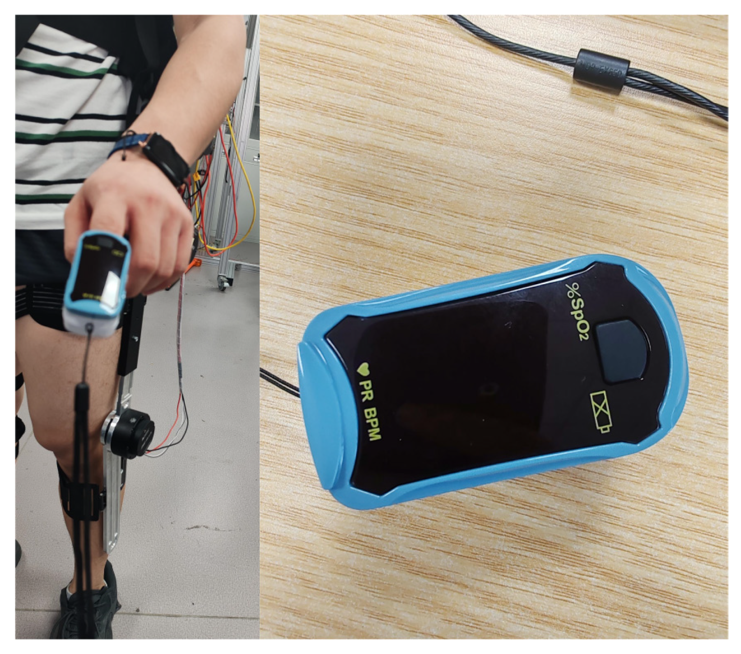 The human metabolic cost experiment will measure the wearer’s blood oxygen and heart rate at the beginning and end of the experiment. The instrument utilised in this study is a finger-clip pulse oximeter manufactured by Shanghai Haier Medical Technology Co., a company based in Shanghai, China. As illustrated in