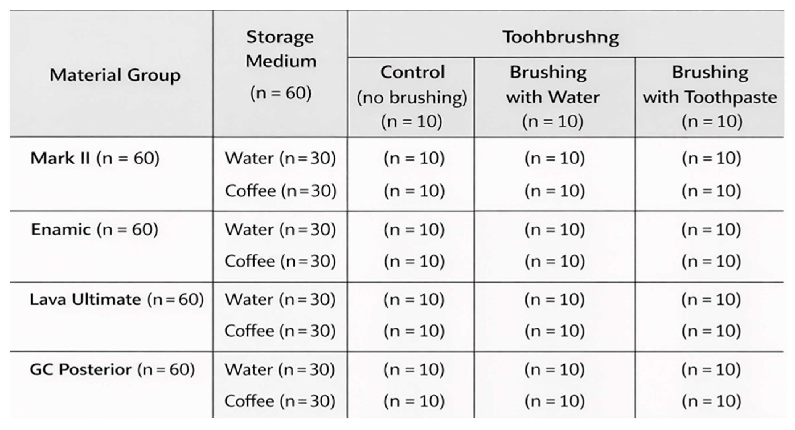16]. To compensate for potential specimen loss or measurement variability commonly encountered in dental materials research, the sample size was increased to 240 specimens, resulting in 10 specimens per group. Bonferroni adjustment was applied for post hoc comparisons to control the family-wise error rate in the context of multiple testing. For each material, specimens were randomly allocated using a computer-generated randomization list to subgroups according to storage medium (deionized water or coffee) and toothbrushing protocol (no brushing, brushing with water, brushing with toothpaste). Color change (ΔE) and surface roughness (Ra) were assessed.