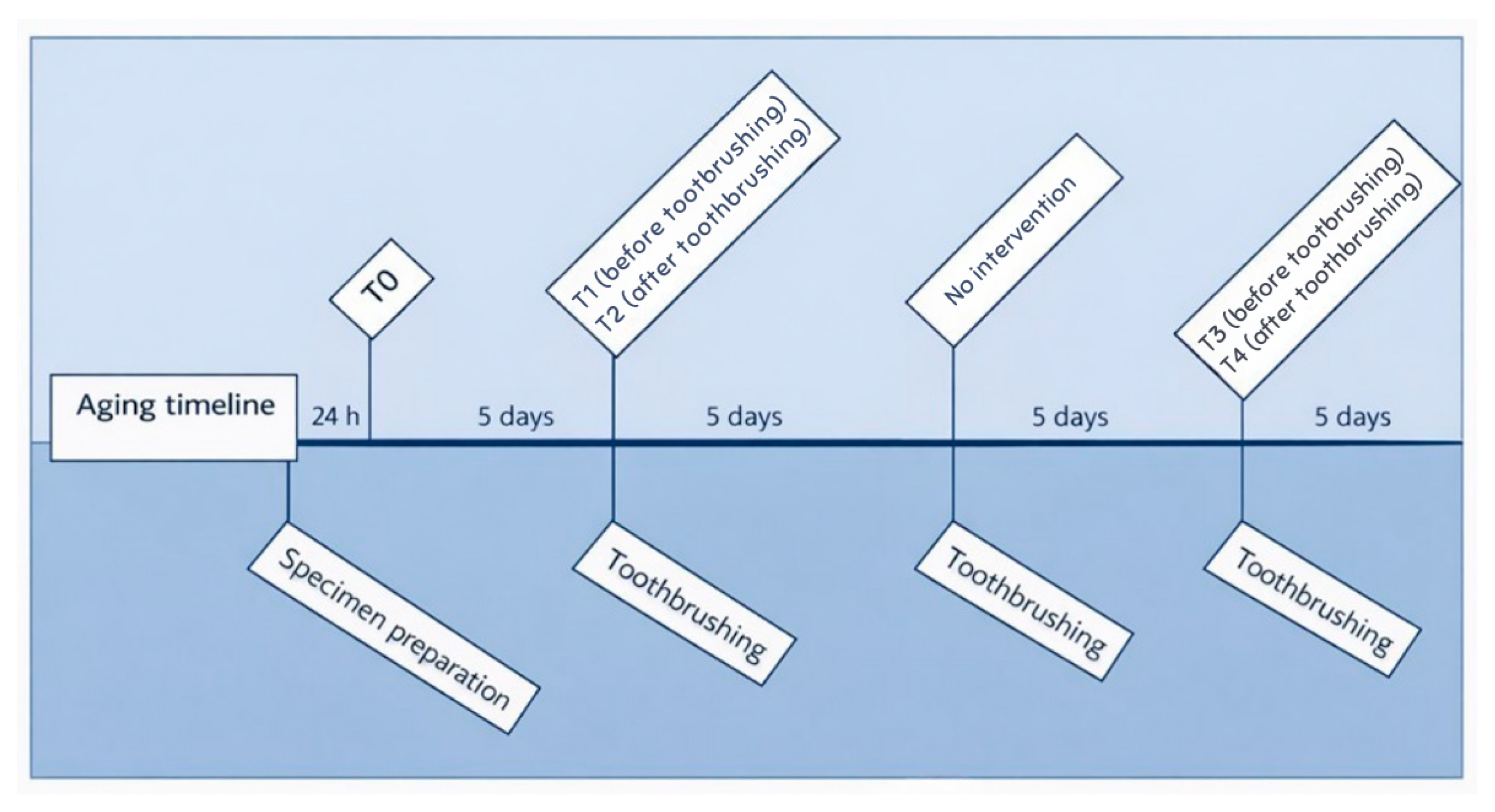 10]. Three aging cycles were performed, resulting in a total of 15 days of immersion and three brushing phases per specimen.