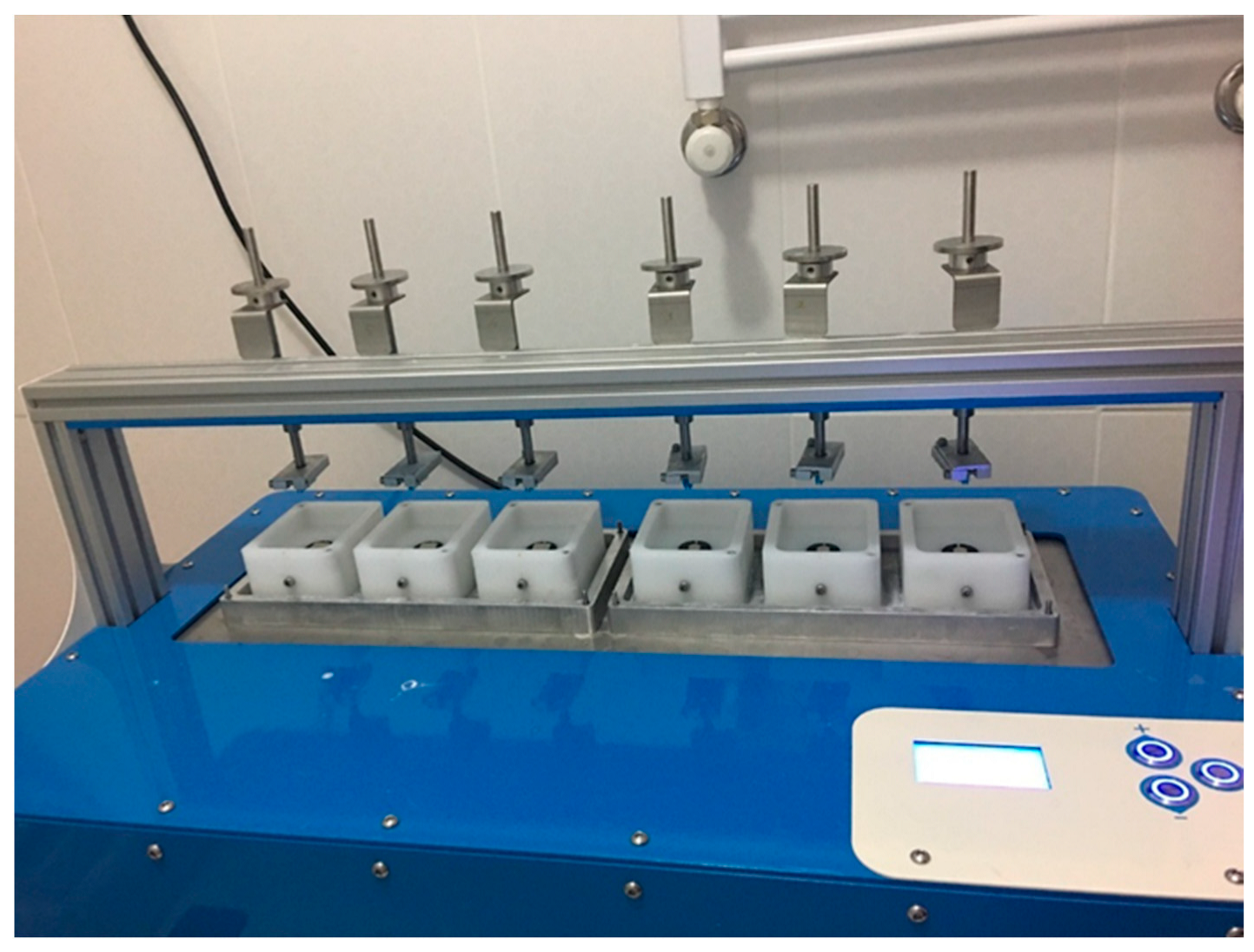 Figure 3). Each brushing phase comprised 585 linear strokes over the specimen surface at a horizontal stroke length of 3.8 cm and a frequency adjusted to deliver 585 strokes in 150 s. The brushing stroke calculation was based on established in vitro methodology [