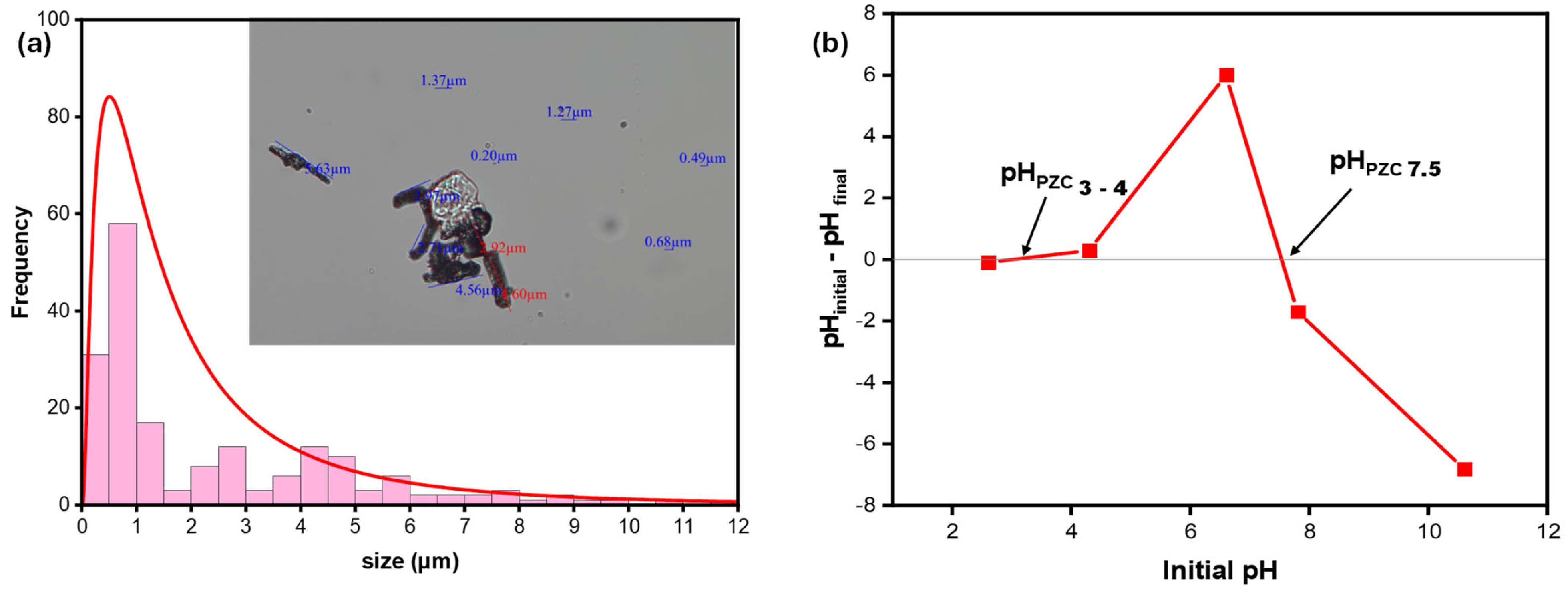 The size distribution and morphology of PET micro- and nanoplastics were examined using a fluorescent microscope (MX6300, Meiji Techno Co., Saitama, Japan) equipped with a 4K Moticam4000 microscope camera. The analysis was conducted under visible light at a micrometer scale with a 100× magnification. The captured fluorescent microscope images were further processed and analyzed for size and shape using Motic Image Plus 2.3S software. The point of zero charge (PZC) of PET microplastics was determined using a pH drift method. Briefly, 2 mg of PET particles were dispersed in 3 mL of aqueous solution containing one drop of 3.35 M KCl to maintain constant ionic strength. The initial pH was adjusted to values of 2.6, 4.3, 6.6, 7.8, and 10.6 using HCl or NaOH. Suspensions were gently mixed and allowed to equilibrate prior to measurement. The final pH was then measured, and the PZC was identified as the pH at which the difference between final and initial pH (ΔpH) approached zero (Figure 1b).