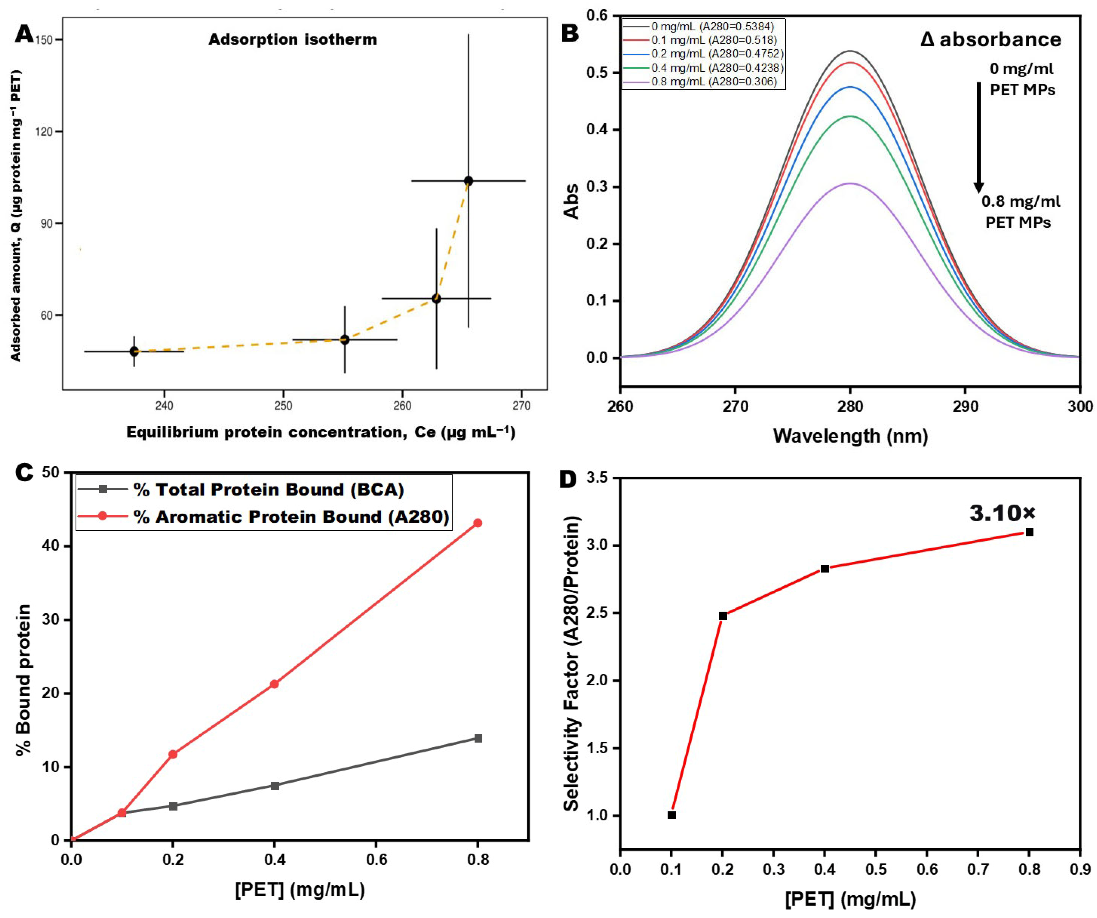 (A) Adsorption isotherm for total protein binding to PET microplastics. The isotherm was constructed by plotting the adsorbed amount normalized to PET mass (Q, µg protein mg−1 PET) against the equilibrium protein concentration (Ce, µg mL−1), obtained under conditions of fixed initial protein concentration and increasing PET loading. The dashed line represents a guide to the eye illustrating Langmuir-type saturable adsorption behavior; no formal isotherm fitting was performed due to the limited number of data points. (B) Aromatic protein adsorption quantified by UV absorbance at 280 nm (A280), reflecting depletion of aromatic amino acid–rich proteins from solution. (C) Comparative analysis of total protein adsorption measured by BCA assay and aromatic protein adsorption measured by A280, showing preferential removal of aromatic protein fractions with increasing PET concentration. (D) Selective enrichment of aromatic protein adsorption, expressed as the ratio of %A280 bound to %total protein bound, which increases monotonically with PET concentration and reaches a maximum of 3.10-fold at 0.8 mg mL−1 PET.
