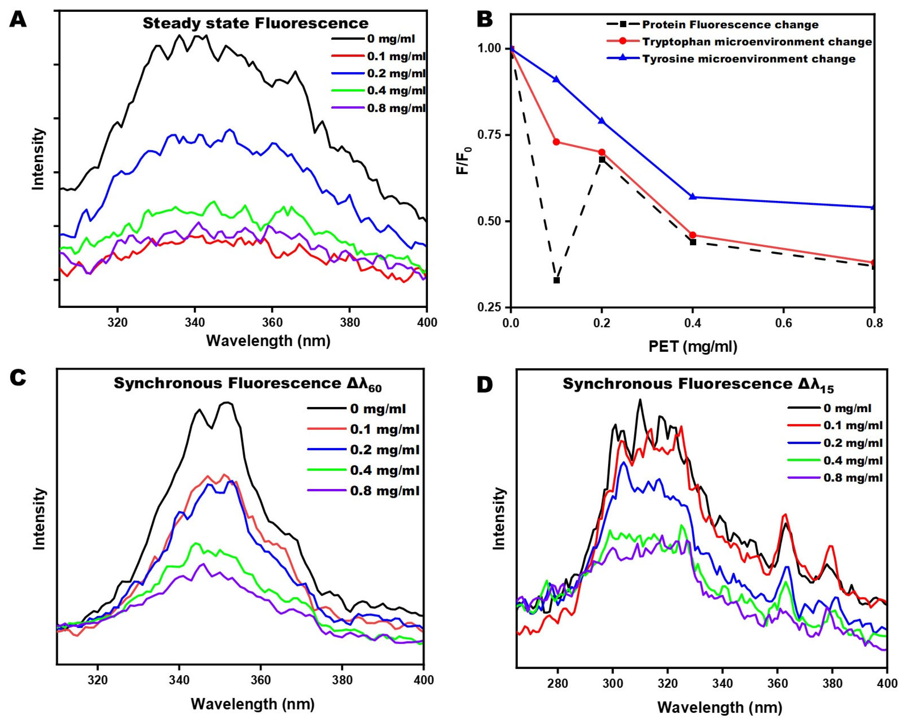 Fluorescence spectroscopic analysis of cedar pollen proteins upon interaction with PET microplastics. (A) Steady-state fluorescence emission spectra of cedar pollen proteins after exposure to increasing concentrations of PET microplastics, showing PET-dependent modulation of intrinsic protein fluorescence. (B) Normalized fluorescence intensity ratio (F/F0) plotted as a function of PET concentration, where F represents the maximum emission intensity after PET exposure and F0 corresponds to untreated protein, highlighting concentration-dependent fluorescence. (C) Synchronous fluorescence spectra recorded at Δλ = 60 nm, selectively probing tryptophan residues and revealing PET-induced changes in the microenvironment of buried aromatic residues. (D) Synchronous fluorescence spectra recorded at Δλ = 15 nm, selectively probing tyrosine residues and indicating alterations in surface-exposed aromatic environments upon PET interaction.