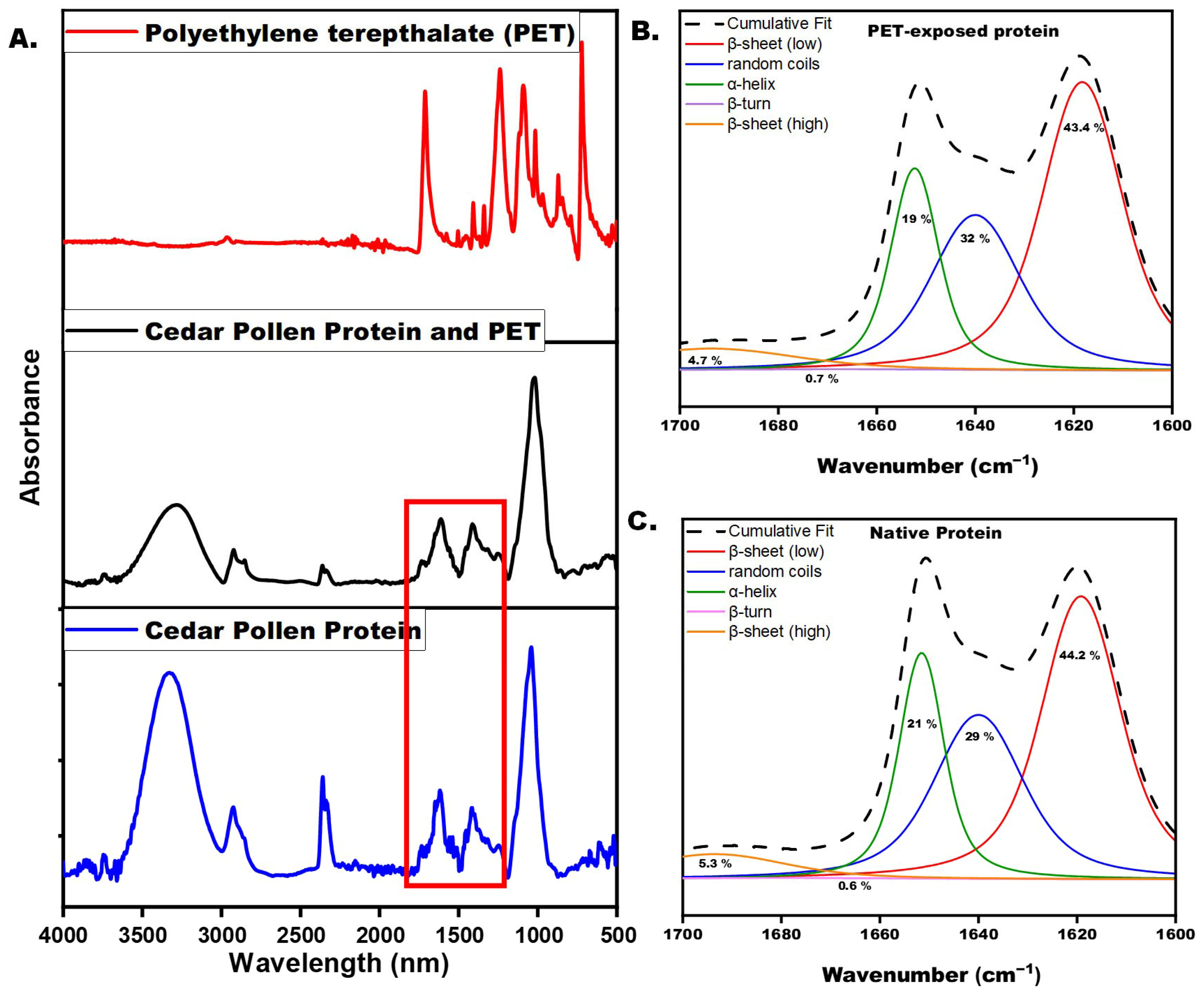 FTIR analysis of cedar pollen protein structural changes upon PET exposure: (A) full-range spectra comparison, (B) amide I deconvolution of PET-exposed protein, and (C) amide I deconvolution of native protein.