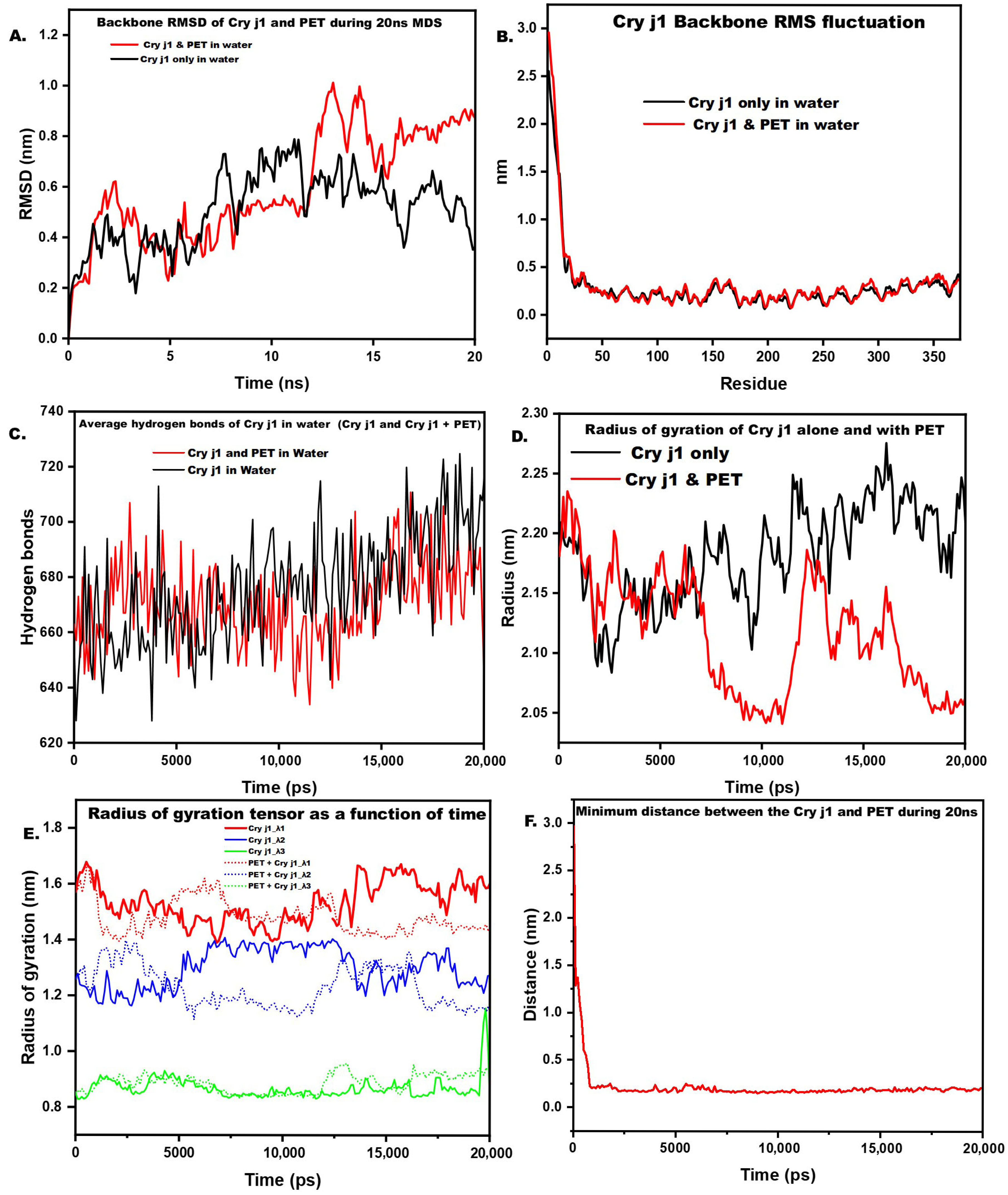 Molecular dynamics analysis of Cry j 1 adsorption onto PET. (A) Root mean square deviation (RMSD) of PET alone and PET in complex with Cry j 1 during the simulation. (B) Root mean square fluctuation (RMSF) of Cry j 1 backbone atoms in the free and PET-bound states. (C) Time evolution of hydrogen bonds in the free Cry j 1 system and in the Cry j 1–PET complex. (D) Radius of gyration (Rg) of Cry j 1 in aqueous solution and upon adsorption onto the PET surface. (E) Radius of gyration tensor components (Rgx, Rgγ, Rg𝓏) illustrating anisotropic shape redistribution of Cry j 1 upon PET adsorption. (F) Minimum distance between Cry j 1 and the PET surface, indicating the onset of stable protein–surface contact.