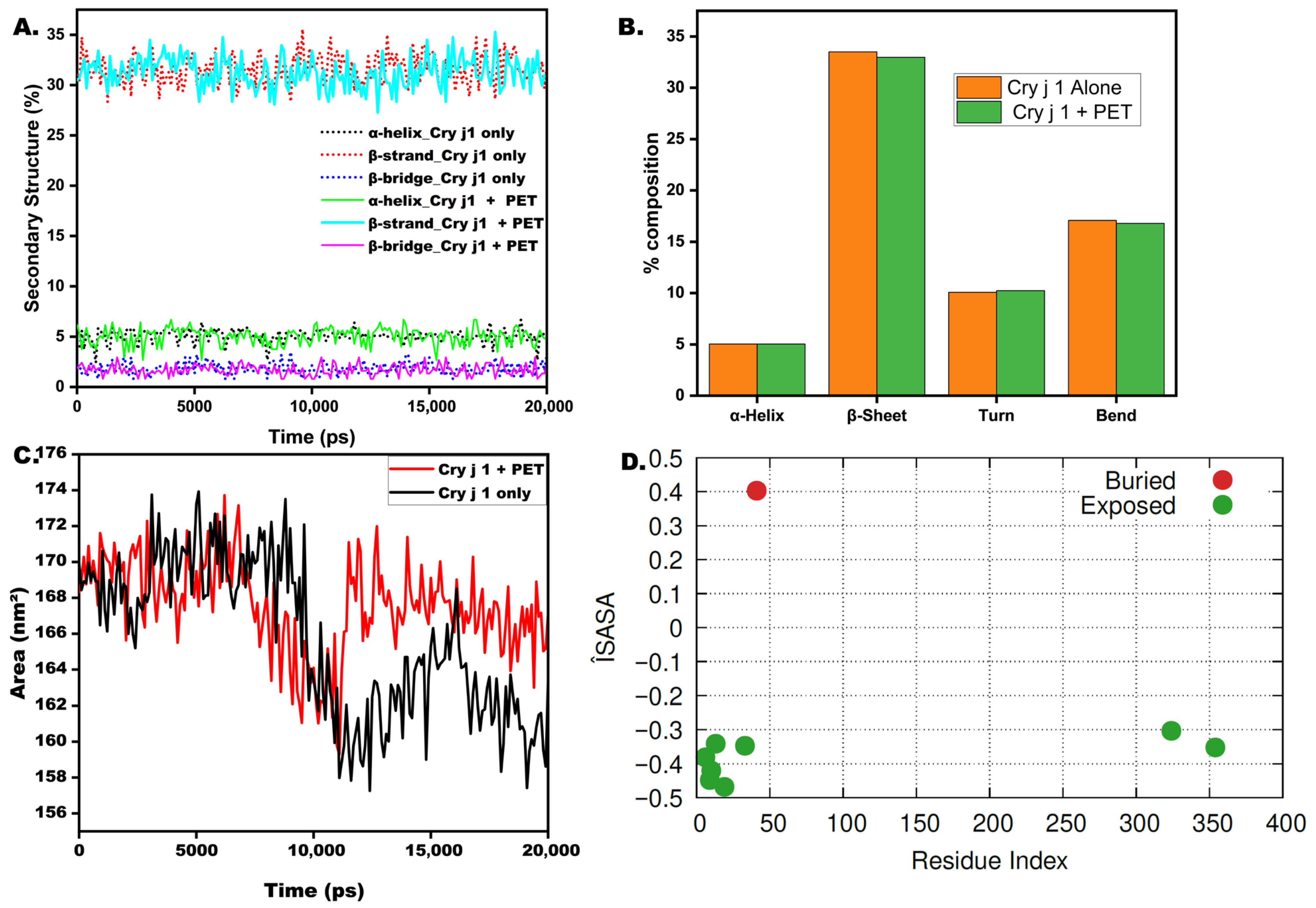 Secondary structure and solvent accessibility changes in Cry j 1 upon PET adsorption. (A) DSSP secondary structure evolution of Cry j 1 in aqueous solution and in the PET-bound state. (B) Percentage composition of major secondary structure elements (α-helix, β-sheet, turn, and bend) for free and PET-bound Cry j 1. (C) Time evolution of the total solvent accessible surface area (SASA) of Cry j 1 in the free and PET-bound systems. (D) Residue-level SASA differences between free Cry j 1 and the Cry j 1–PET complex, highlighting residues involved in localized adsorption and surface anchoring. These residues (Residue 6: Leu (L), Residue 9: Val (V), Residue 10: Ala (A), Residue 13: Phe (F), Residue 19: Cys (C), Residue 33: Trp (W), Resokidue 324: Gly (G), Residue 354: Ser (S)) show increased solvent exposure (residues with increased exposure (ΔSASA < 0) in the PET-bound state), suggesting reorientation or partial lifting from the protein core during adsorption. Residue 41: Cys (C) exhibited reduced SASA (buried (ΔSASA > 0)), consistent with direct surface anchoring or shielding at the protein–PET interface.
