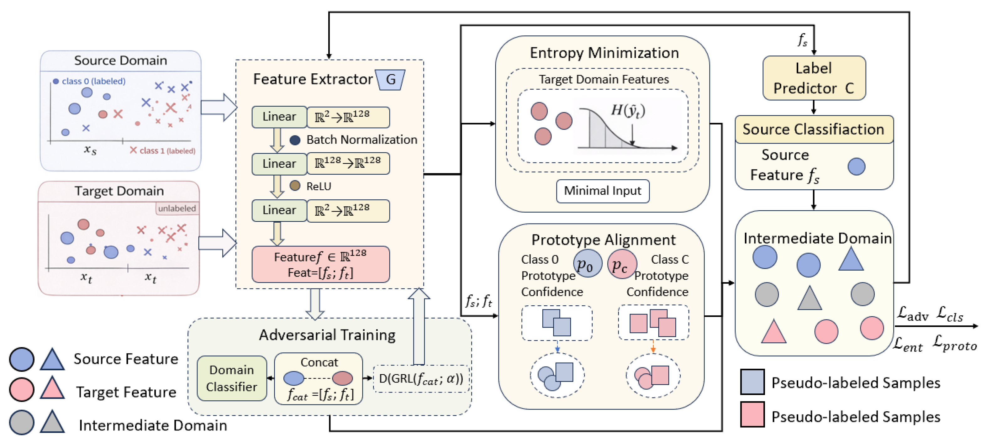 During training, the Adam optimizer was employed to update model parameters, with the learning rate set to and the weight decay coefficient set to . The models were optimized over 150 training epochs. The source domain data were split into 80% for training and 20% for testing, while the target domain data were split into 50% for training and 50% for testing. Importantly, the target domain training set did not utilize real labels. The batch size was set to 128 in each training epoch to ensure sufficient sample support for gradient updates.