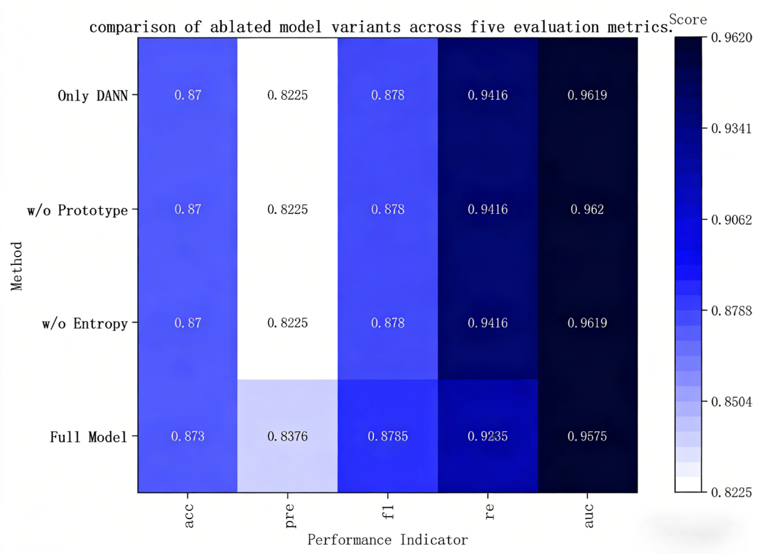 Figure 2). From the overall color distribution, it is evident that the three variants (Only DANN, w/o Entropy, and w/o Prototype) exhibit nearly identical color intensities across the four metrics of Accuracy, Precision, F1-score, and Recall. This suggests that domain adversarial alignment is the main driving force behind model performance under the current transfer setting, providing a stable foundational alignment capability for target-domain transfer. In contrast, the removal of either entropy minimization or prototype guidance does not lead to significant performance degradation, indicating that these modules primarily serve as fine-tuning mechanisms for decision boundaries and class-conditional structures, rather than being the sole contributors to baseline performance.