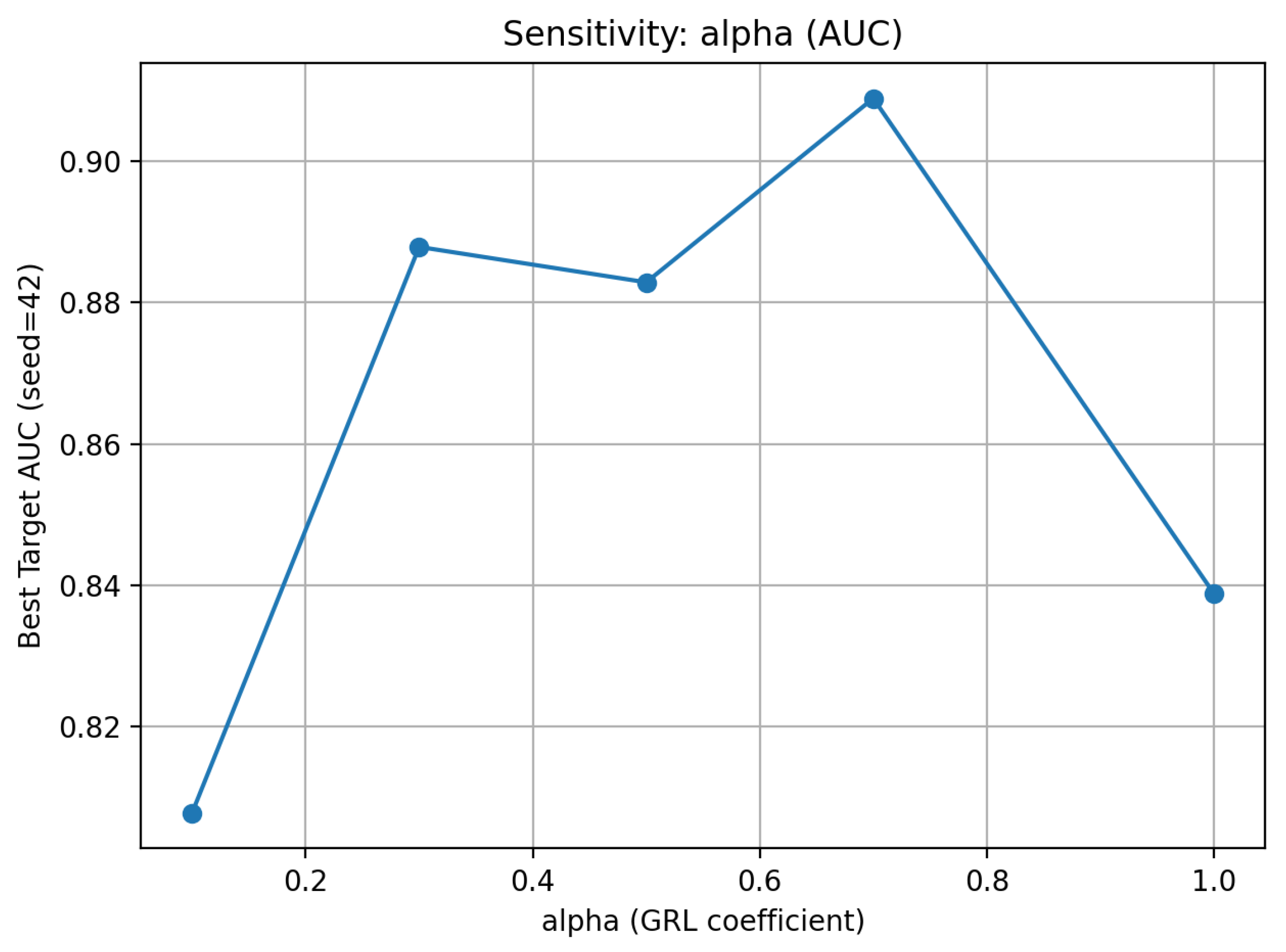 while keeping all other hyperparameters fixed. For each setting, the model was trained using the same protocol and the corresponding AUC on the target domain was recorded. The results cover a range of values for