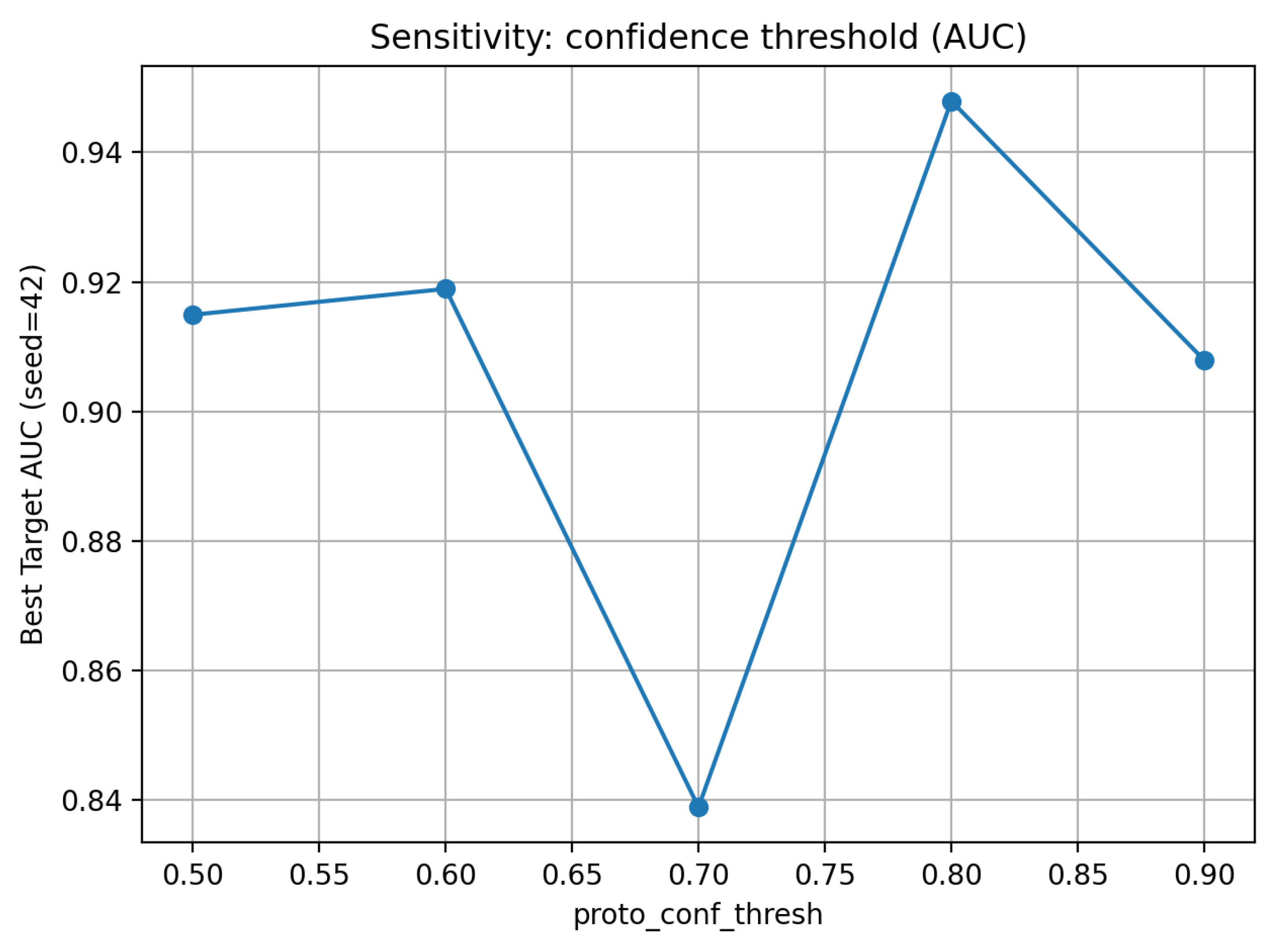 . When the threshold is reduced to 0.7, the AUC drops noticeably to 0.84, suggesting that more noisy pseudolabels are retained and the resulting class-conditional alignment can be corrupted, leading to negative transfer. When the threshold is increased to 0.9, the AUC also slightly decreases, which is likely because overly strict filtering retains too few target samples and yields unreliable class-wise statistics. Overall, these results support choosing
