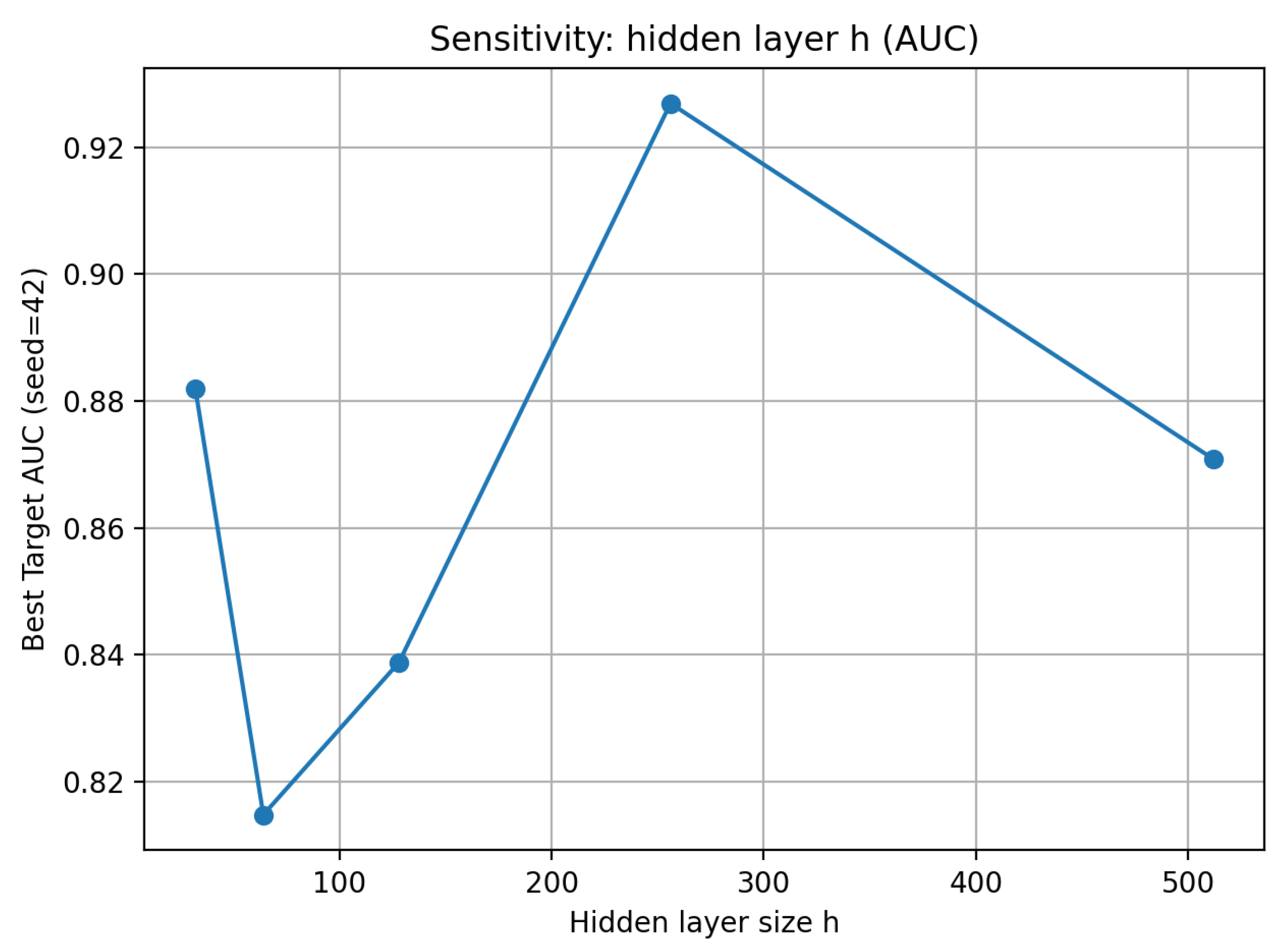. With a smaller hidden layer size, the performance is lower, indicating that limited model capacity may restrict representation learning and hinder the learning of robust decision boundaries under domain shift. When