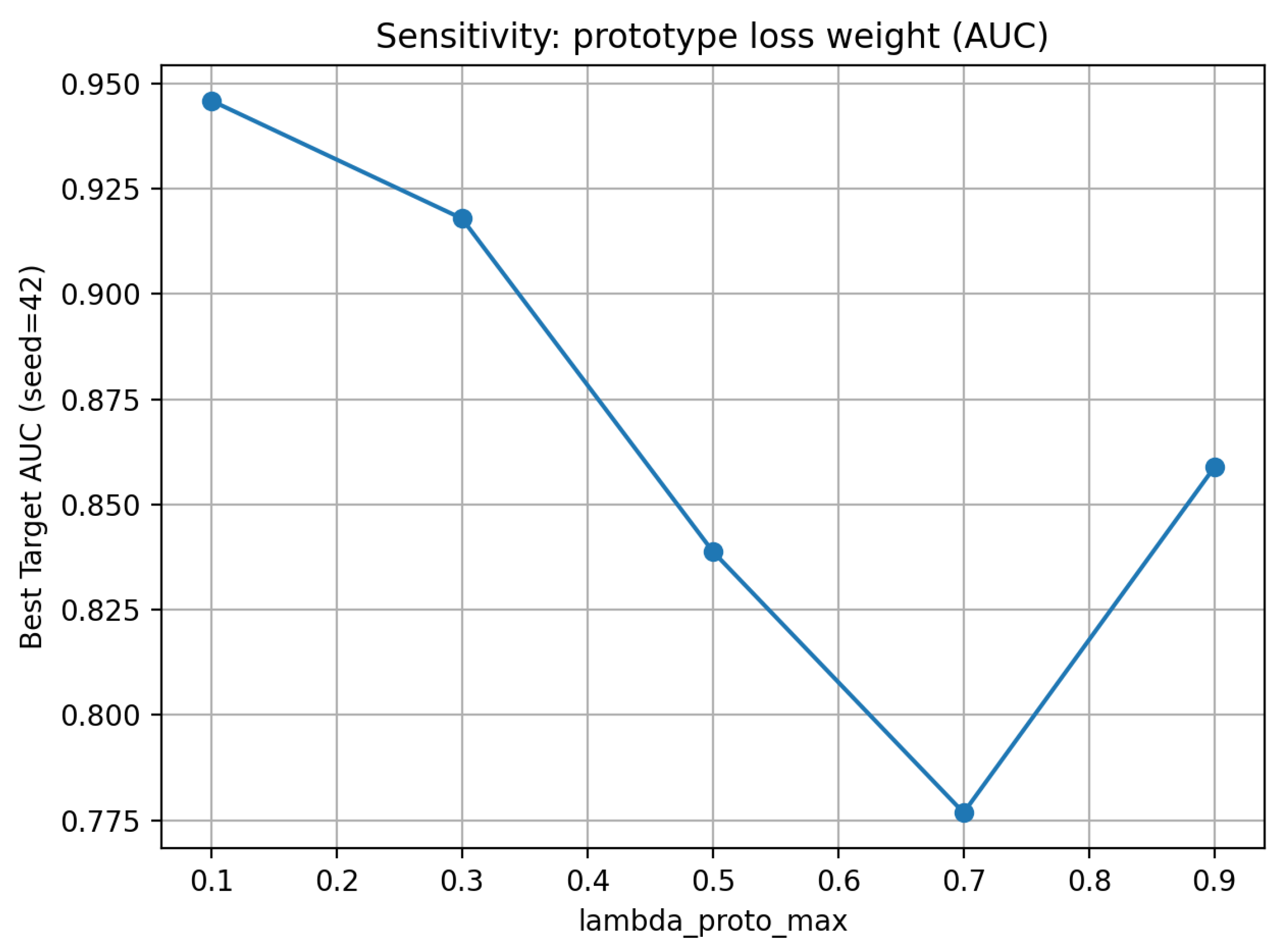 increases to 0.5 and 0.7. This observation suggests that prototype alignment acts as a strong class-conditional constraint and is highly sensitive to pseudolabel quality. When the prototype loss is overly weighted, target samples with noisy pseudolabels may be forcibly pulled towards incorrect prototypes. This distorts class clusters and amplifies the effect of residual noise, causing negative transfer. Hence, we set