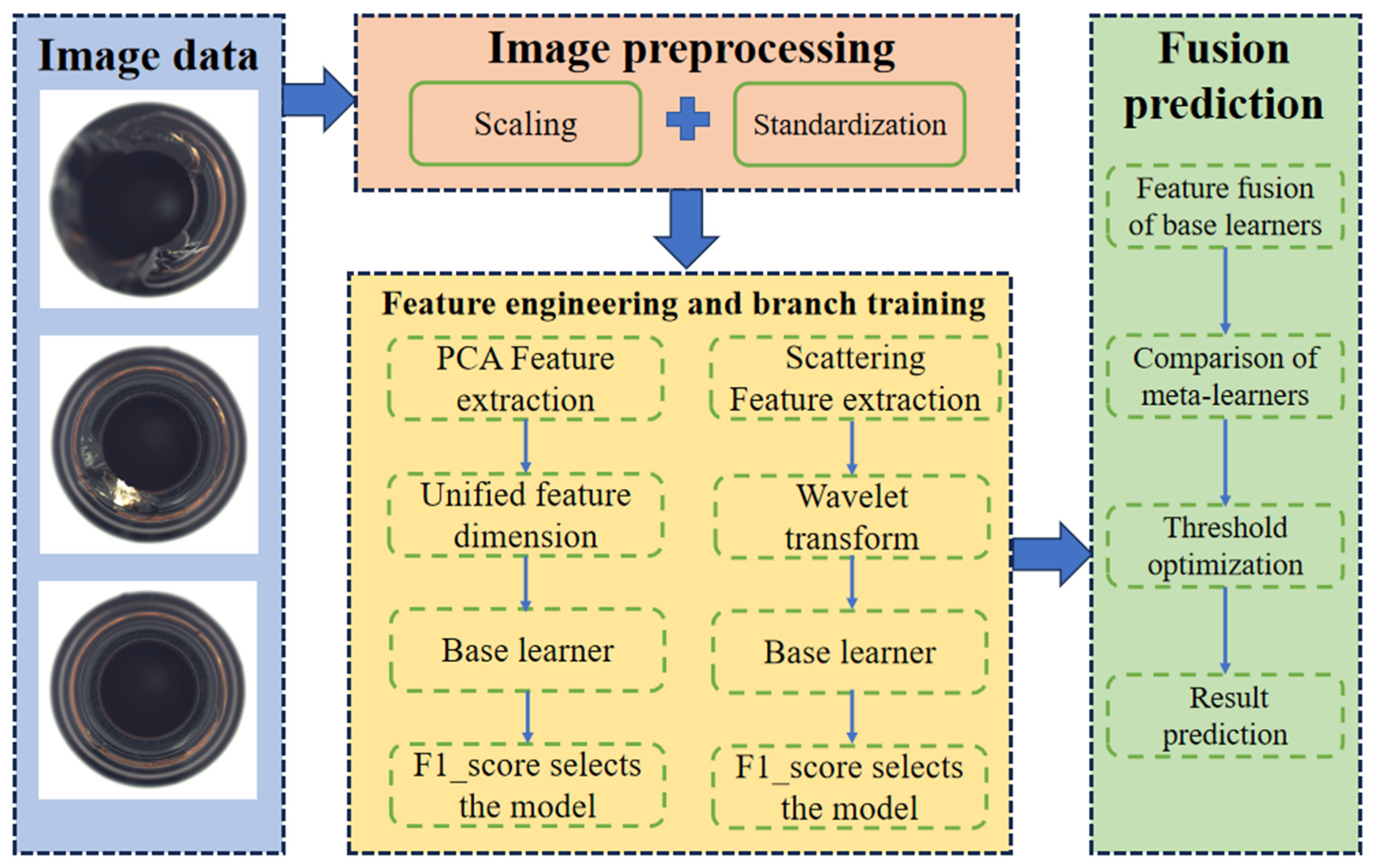 This manuscript is intended to be directly reusable: researchers and practitioners can replicate the pipeline with standard machine-learning toolkits, replace individual modules (feature branches, base learners, calibration strategies, meta-learners), and deploy the method in production-line environments where GPUs or large-scale defect annotations are unavailable. From a practical perspective, the proposed framework can be integrated into resource-constrained industrial inspection systems, providing a favorable trade-off among detection performance, computational cost, and interpretability, which can further reduce rework and waste and improve operational safety.
