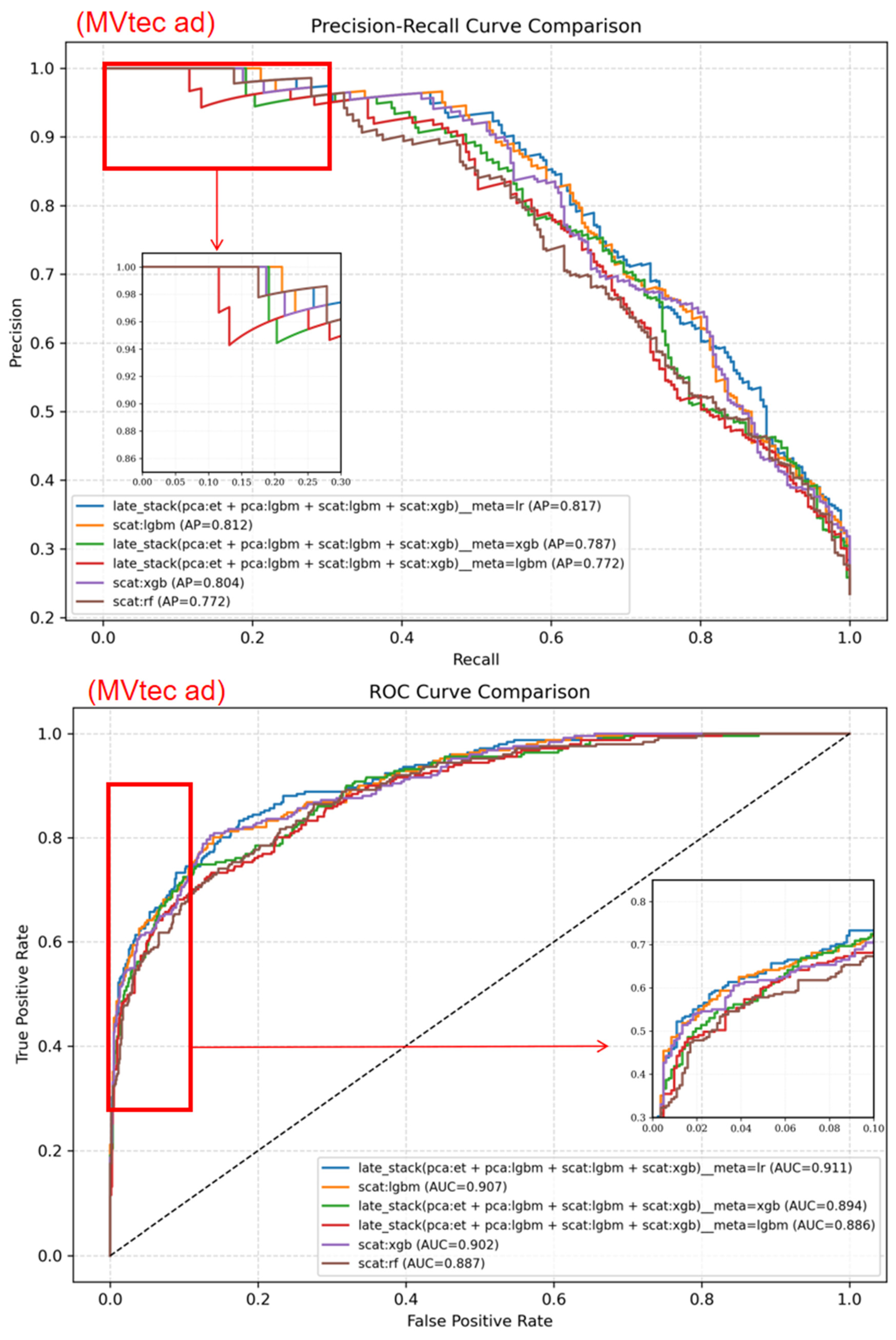 Figure 3) the top methods are already tightly clustered in AP/AUC, and stacking mainly acts as a robust combiner rather than producing a clear margin over the best single model.