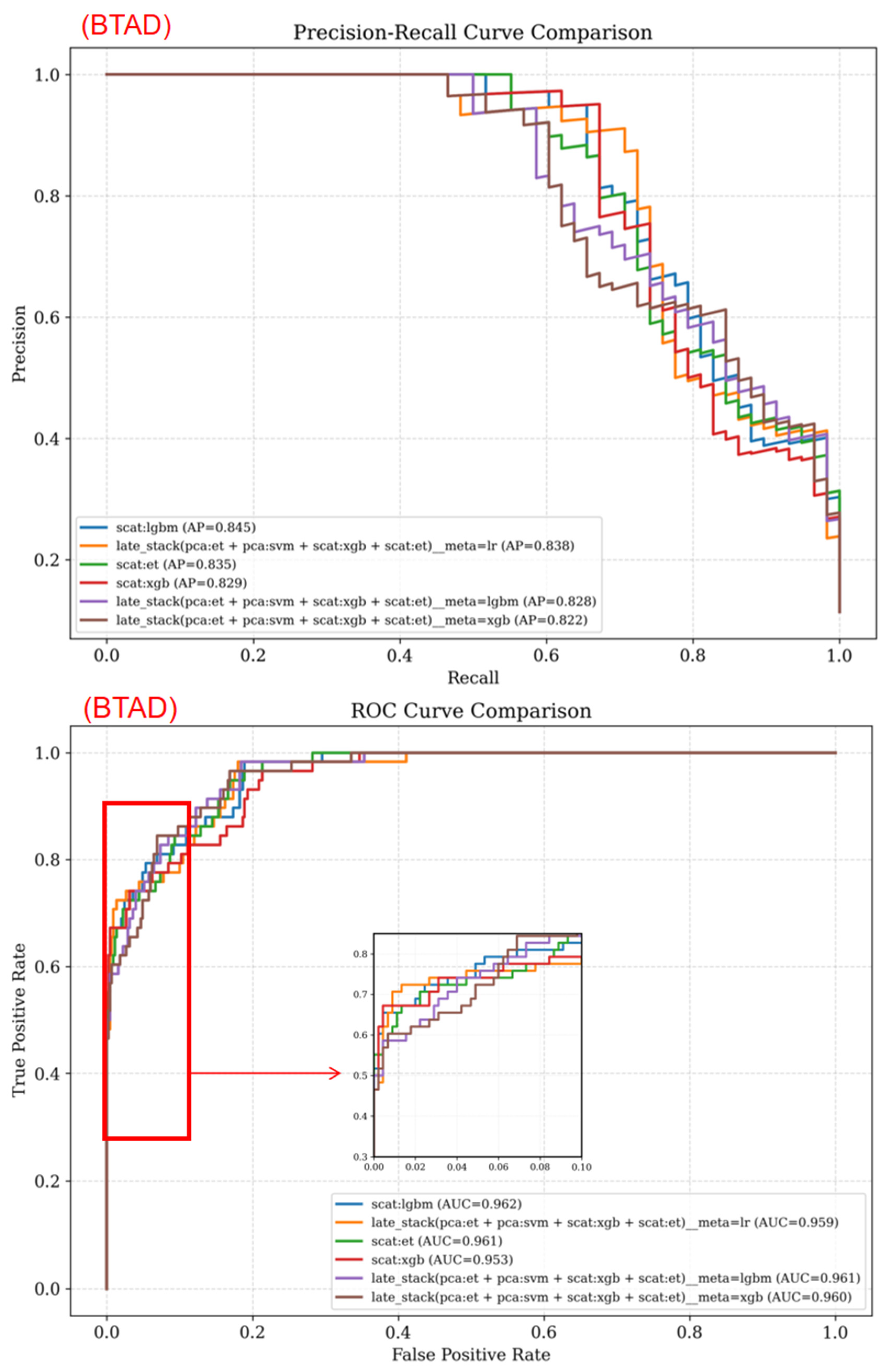 Figure 3 (BTAD validation set), the PR and ROC curves of the top methods are closely clustered, indicating that the performance gap among strong learners is relatively small on this dataset. On the PR curves, SCAT-LGBM achieves the best ranking performance with the highest AP (0.845), while Stacking-LR remains competitive (AP = 0.838) and is comparable to other strong scattering-based models (e.g., SCAT-ET, AP = 0.835). The ROC curves show a similar trend: the best AUC is obtained by SCAT-LGBM (0.962), followed by SCAT-ET (0.961) and stacking variants (AUC = 0.959–0.960). Overall, these results suggest that BTAD can be well handled by a single strong scattering-based classifier, whereas stacking provides a stable and consistently high-performing alternative, with improvements that are marginal in terms of AP/AUC due to the already saturated discrimination on this benchmark. This is likely because the strongest base learner already offers near-saturated separability on BTAD, leaving limited room for further gains from late fusion.