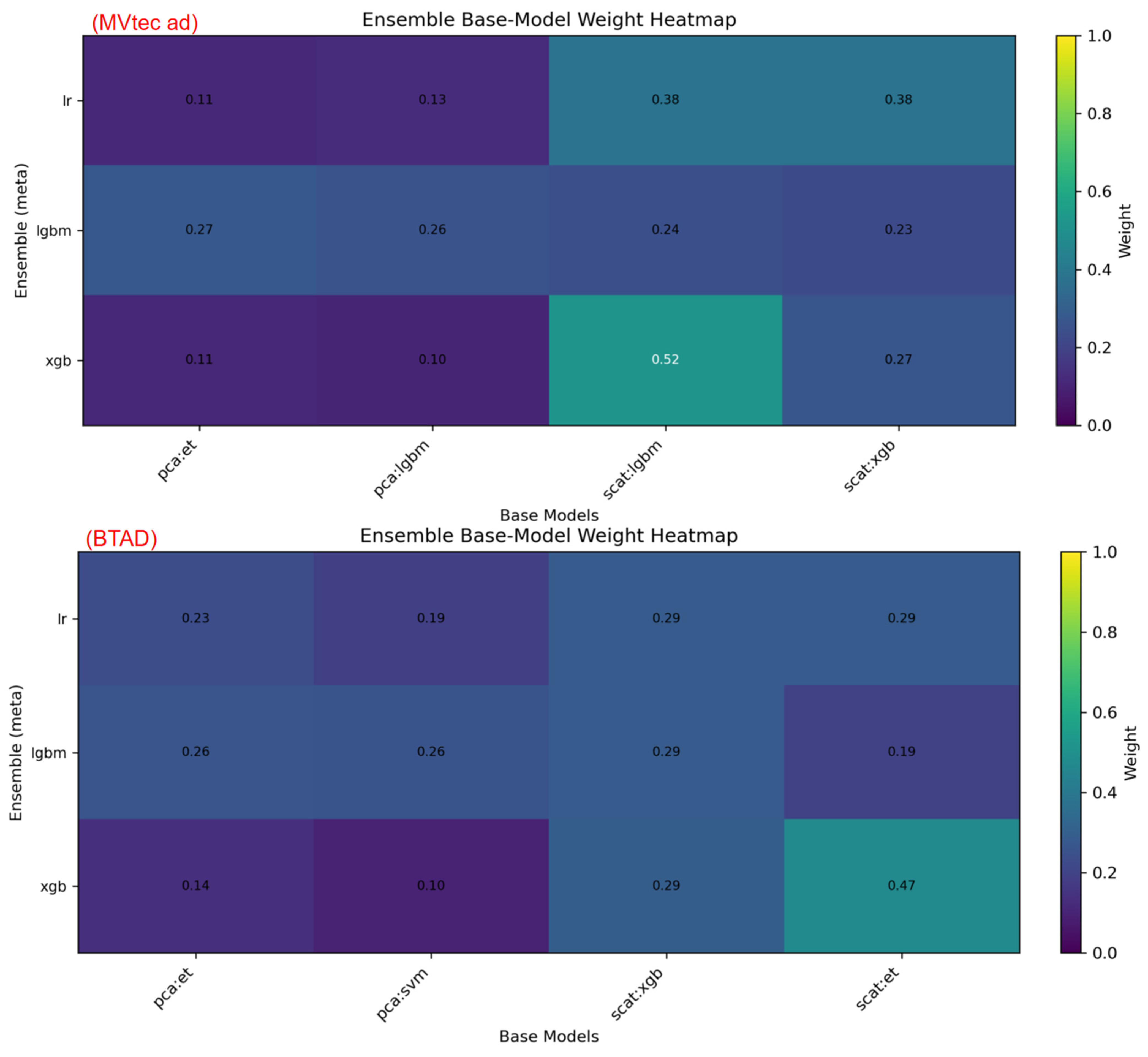 Figure 4 reports the normalized weights assigned to base learners by different meta-learners. On MVTec AD, the fusion consistently places larger weights on scattering-based predictors than on PCA-based ones. In particular, the LR meta-learner allocates most of the mass to the two scattering models (scat:lgbm = 0.38, scat:xgb = 0.38), while the PCA branch receives smaller contributions (pca:et = 0.11, pca:lgbm = 0.13). This “two-strong-model” weighting pattern suggests that LR is exploiting complementary information from multiple scattering predictors rather than relying on a single expert. In contrast, the XGB meta-learner is more selective and strongly emphasizes scat:lgbm (0.52), with a secondary weight on scat:xgb (0.27), indicating a sharper preference among base learners.