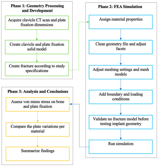 This study employs a quantitative approach, utilizing numerical analysis simulation with ANSYS FEA, to evaluate stress distribution in clavicle and plate fixation variations by analyzing the maximum von Mises stress. This section outlines the phases, steps, and specifics of the research methodology. The methodology follows a three-phase process that encompasses the generation of necessary geometry, FEA simulation, analysis, and drawing of conclusions. Each phase is segmented into specific steps that outline the process and parameters of this study, based on previous studies. Following this, the methodology covers research design, data collection and analysis methods, ethical considerations, limitations, and conclusions.