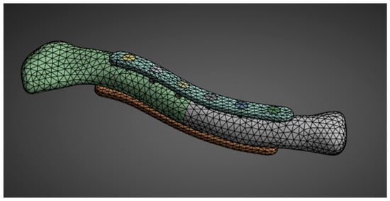 The second phase of the methodology covers all the steps in preparing and conducting the FEA simulation. The steps are aligned with the common steps for static structural analysis simulations. For material properties, the needed inputs are Young’s modulus and Poisson’s ratio; the other material properties are derived automatically from the two inputs. With the geometry created in the first phase, all the geometries are assembled in Ansys SpaceClaim. Utilizing a SubD geometry type reduced the number of facets, which facilitated the simulation. Element sizing is adjusted accordingly. The element sizes are reduced if errors occur due to incomplete meshing or if there are too many elements and nodes for the simulation to run. This study employs a 3 mm bone mesh size, similar to that used by Yurteri et al. [6], and a 1 mm plate mesh size shown in Figure 7. Reducing the size to less than 3 mm results in an error because some simulation setups exceed the allowable number of nodes and elements for the Ansys Student Version.