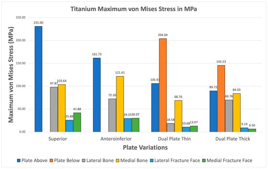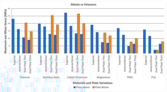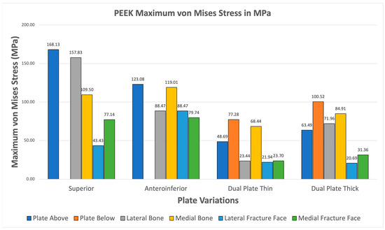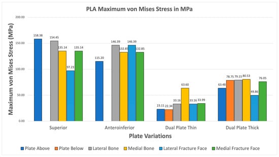 The PLA variations ultimately fail the viability criteria, with only the superior variation achieving higher maximum von Mises stress for the plate over bone shown in Figure 18. Fracture line stresses are all below 150 MPa but near the limit, with a maximum of 146.39 MPa for the anteroinferior variation, with the superior variation following closely. With this, PLA does not show viable use as it fails the first criterion and approaches the limit with the second criterion. Although the results do not indicate viable use, the superior and thick dual plate variations exhibit better performance, with plate and bone stress being similar, and low fracture line stresses observed in the thick dual plate variations.