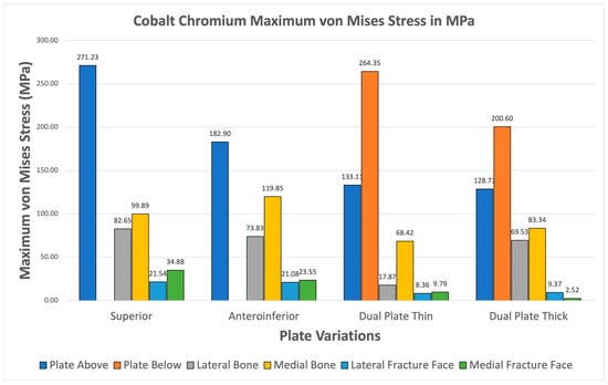 Cobalt Chromium consistently shows higher maximum von Mises plate stresses relative to bone stresses for all variations seen in Figure 15. The fracture line stresses are also all safely below the 150 MPa limit, with the highest at 34.88 MPa, and exhibit the highest variation. The results confirm the viability of Cobalt Chromium, but the likelihood of stress shielding is high, as most of the stress is covered by the implant.
