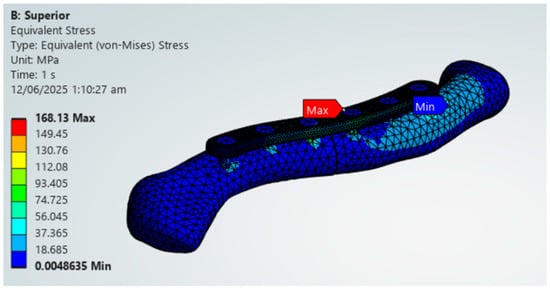 For Stainless Steel, all plate variations show greater maximum von Mises plate stresses compared to bone stresses shown in Figure 14. The fracture line stresses are also significantly below 150 MPa, reaching a maximum of 35.728 MPa, with the superior variation. These results demonstrate the viability of Stainless Steel plate fixations and support its use as a standard material for orthopedic implants.