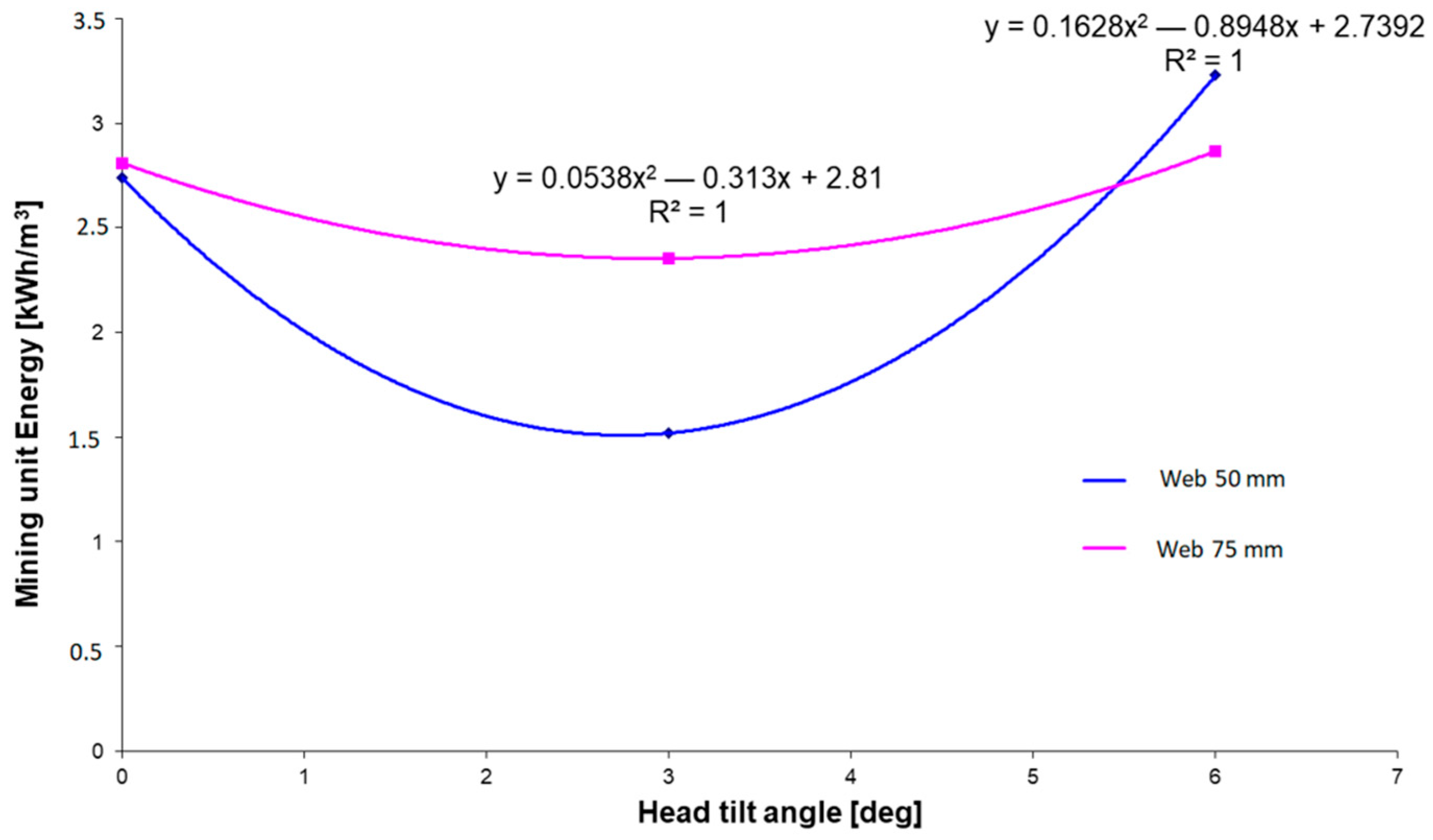 Figure 16 shows the effect of the head tilt angle on the total unit cutting energy for two web depths of a milling disc. The curves described by the second-order polynomial functions have a minimum of the function close to 3°, at which the tilt angle has the lowest specific energy.