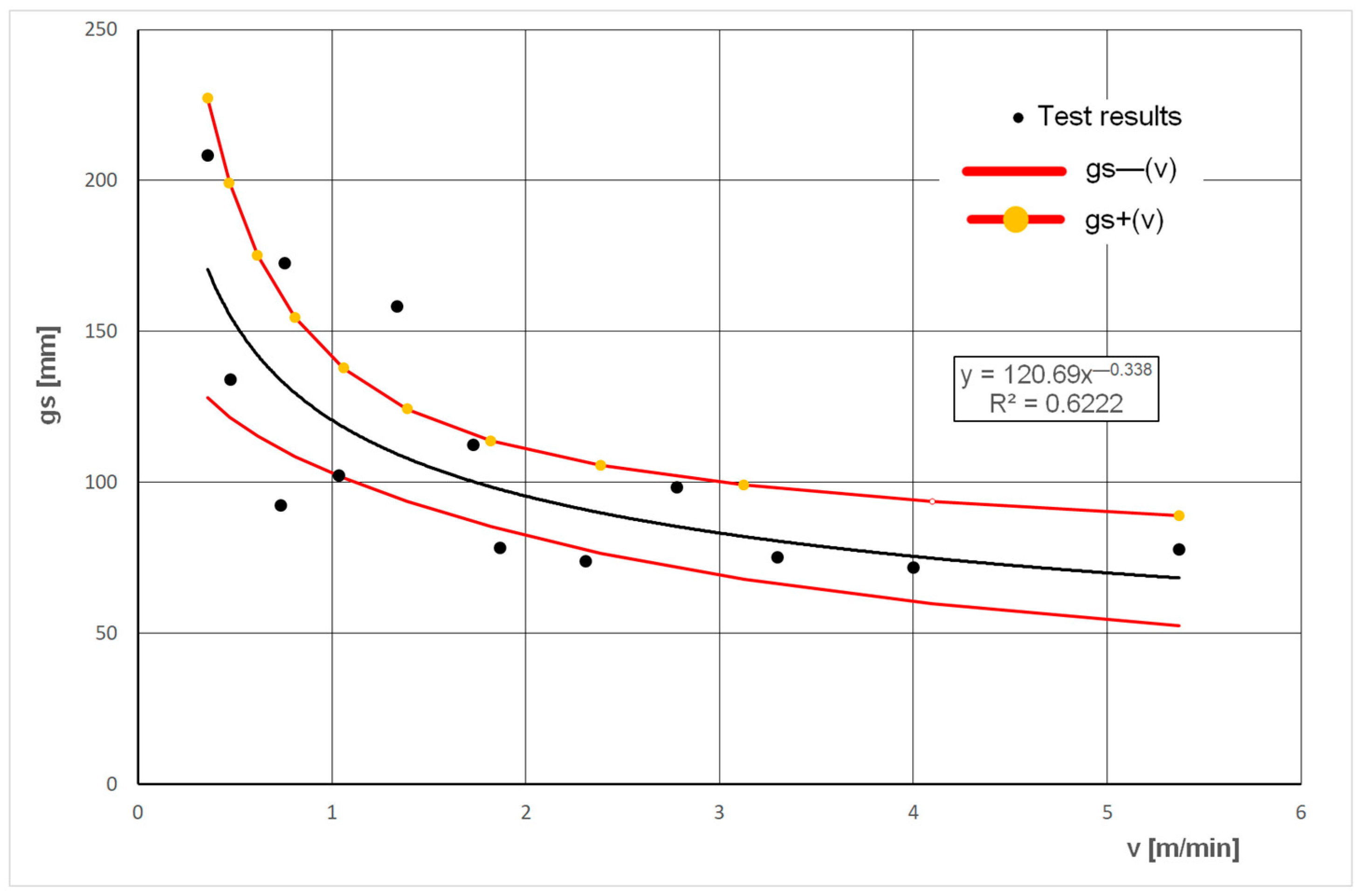 The measurement results obtained are best characterised by the power trend line with the equation shown in