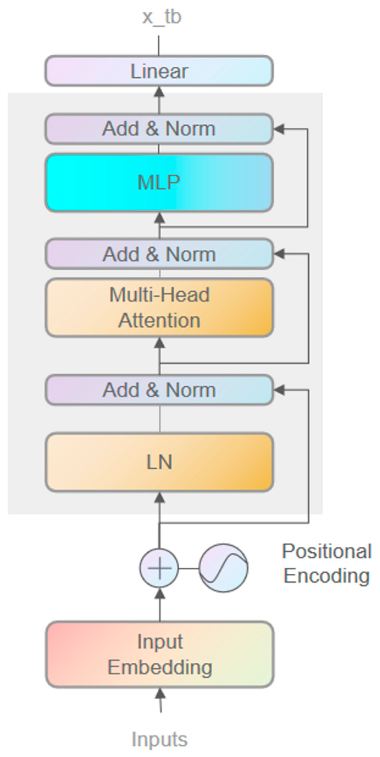 A “residual connection + normalization” structure follows to address gradient vanishing in deep network training and stabilize data distribution. Residual connections allow shallow feature information to propagate directly to subsequent layers, which is essential for stacking multiple TB blocks, while a second Layer Normalization eliminates feature-value fluctuations after residual connections, ensuring stable data distribution for subsequent layers.