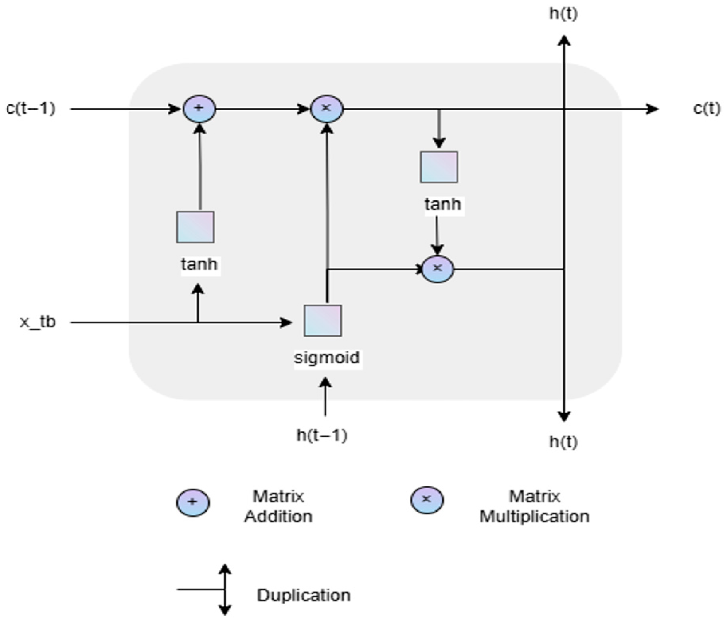 t)) represents the memory unit at the current time step. This structure excels at capturing both short-term and long-term relationships within time series data by updating the cell state
