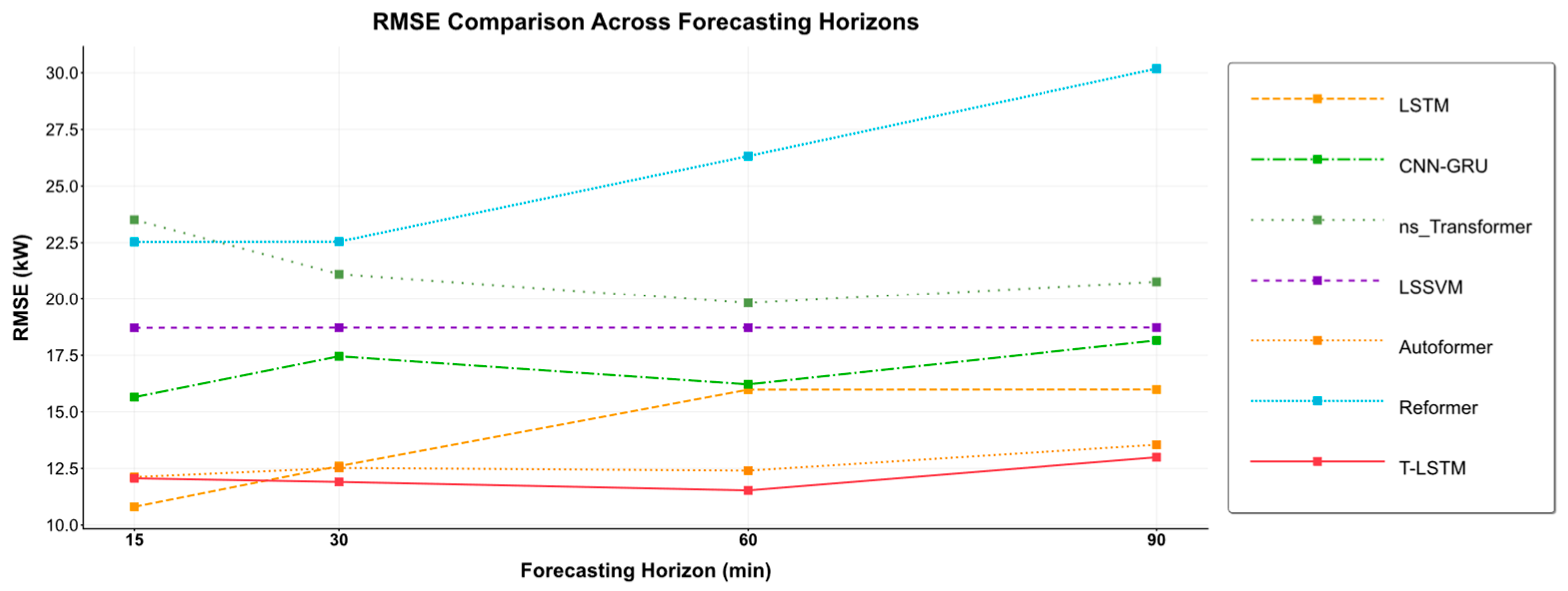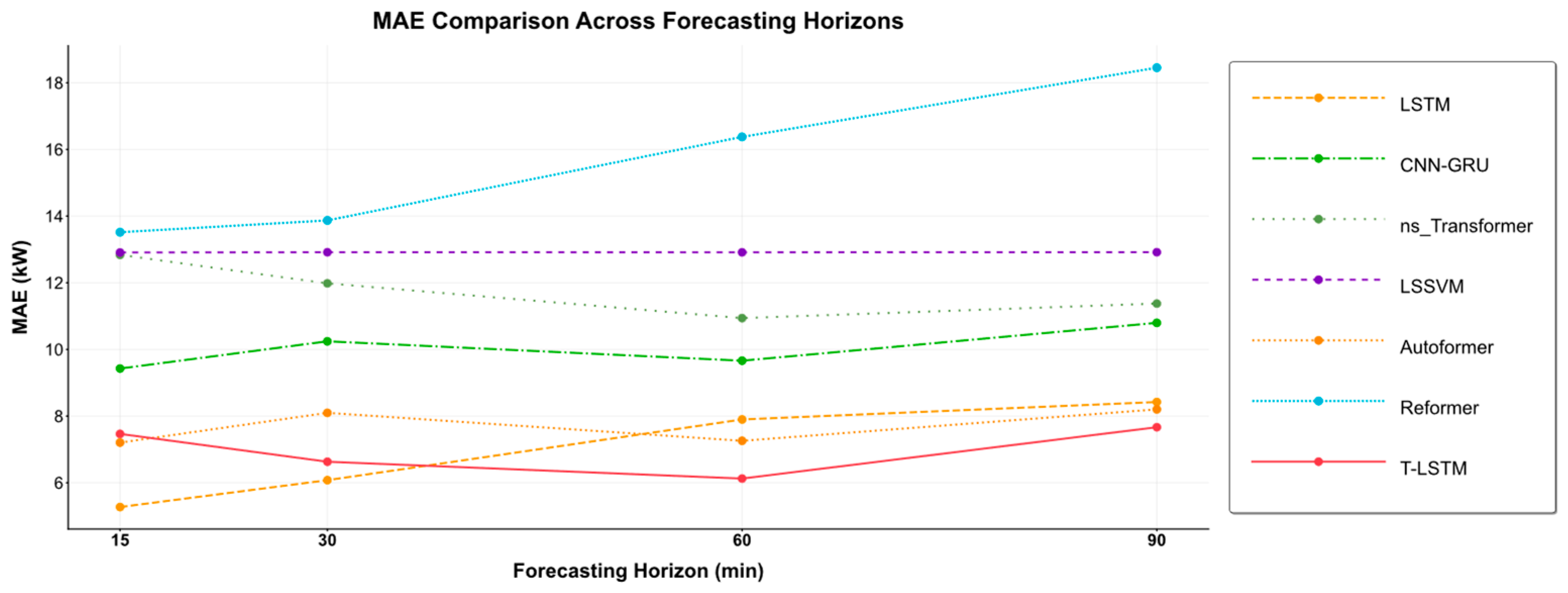 Compared to other benchmarks, Reformer and ns_Transformer exhibit the highest prediction errors across all ranges due to their overly complex architecture, which leads to overfitting of wind power time series with high volatility. CNN-GRU and LSSVM exhibit stable but poor performance, reflecting their limitations in balancing short-term fluctuations and long-term trends. LSTM performs relatively well in short-term (15 min) predictions, with a low MAE of 5.2717. However, over time, its error sharply increases, indicating that it is difficult to maintain the accuracy of long-term predictions. Within the 30 min prediction range, the MAE of LSTM (6.0777) is slightly lower than that of T-LSTM (6.6317). This phenomenon is attributed to the inherent advantage of LSTM in capturing short-term real-time sequence dependencies: within 30 min, wind fluctuations are mainly driven by local, short-term meteorological changes, and LSTM’s classical three-gate mechanism directly simulates this short-term temporal correlation without additional feature fusion overhead. In contrast, T-LSTM integrates multi-scale feature extraction and seasonal trend fusion, which introduces moderate computational overhead but can provide cumulative benefits as the prediction range expands. Autoformer is competitive in the short term (15–30 min), but lacks adaptability to seasonal changes in the long term, while T-LSTM maintains consistent accuracy through the fusion of linear and nonlinear features.