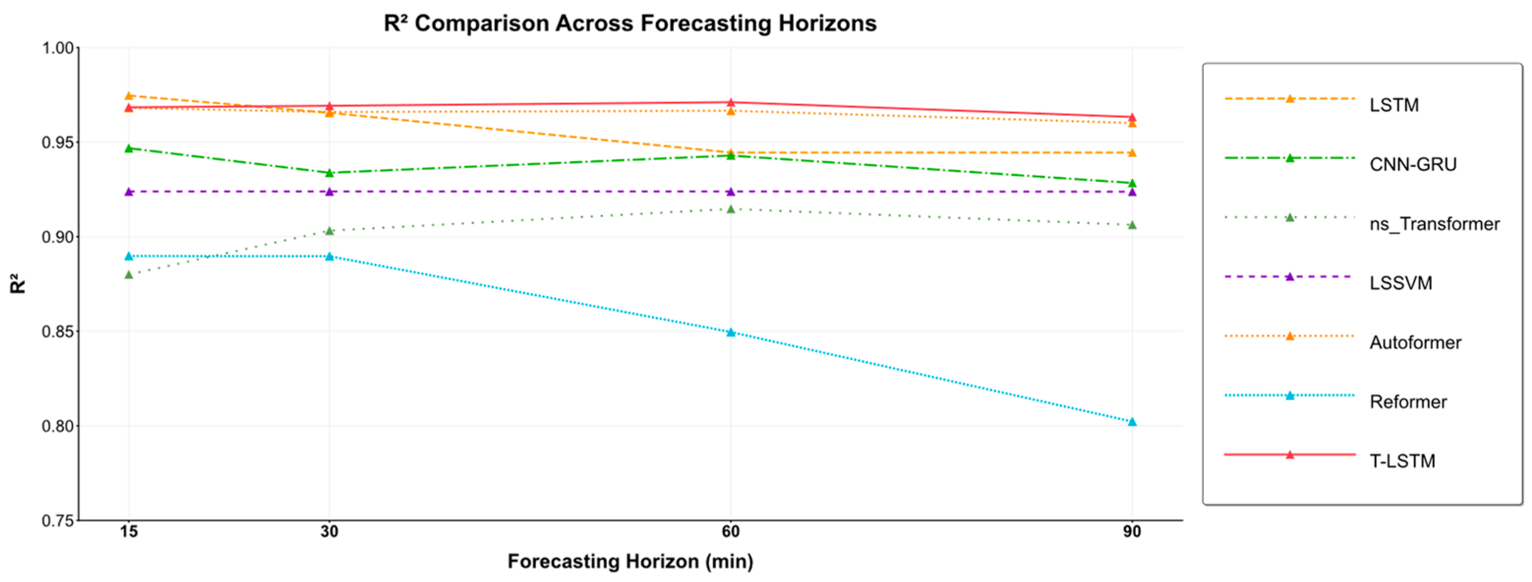 2) of T-LSTM and benchmark models across four seasons for the 60 min prediction horizon. The values in bold in the table represent the optimal performance indicator values.