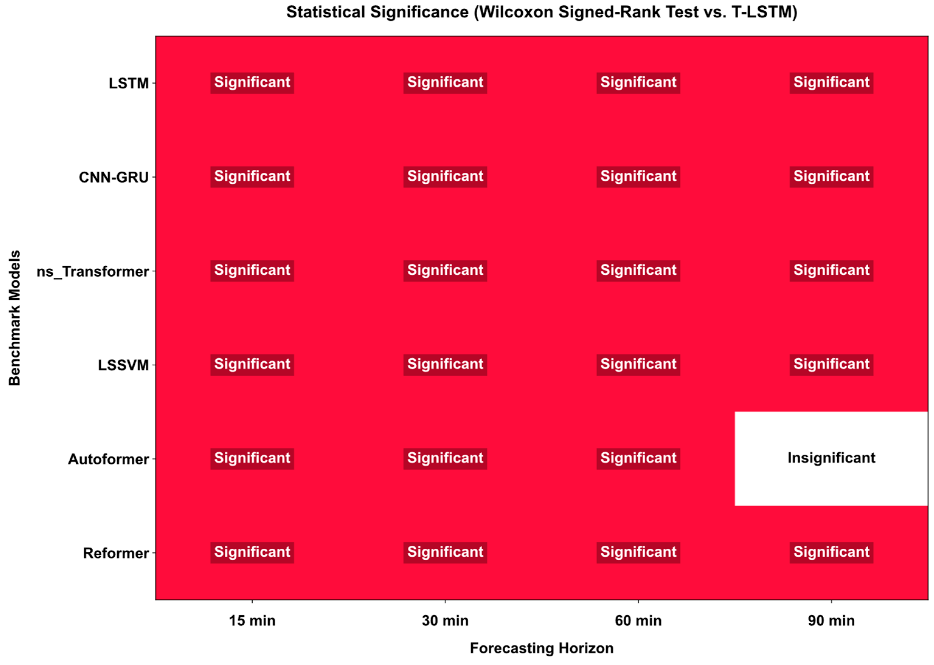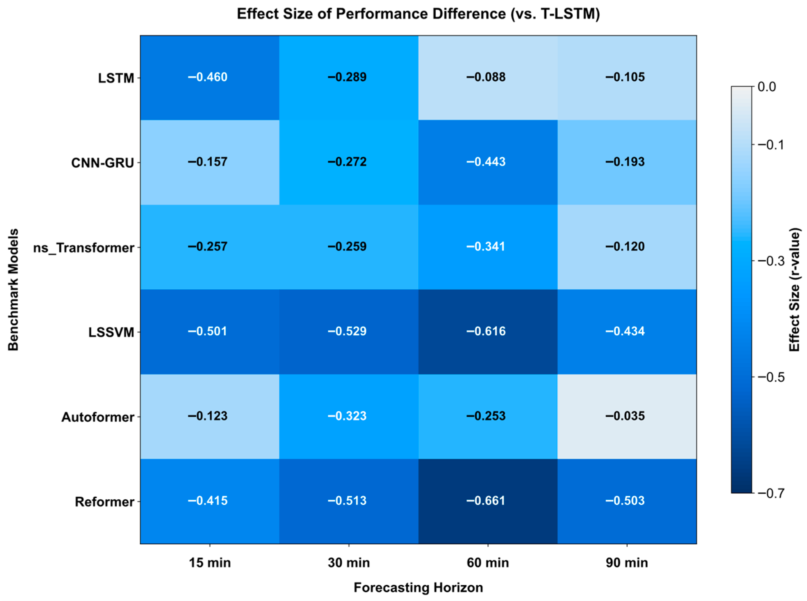 Figure 8 shows the magnitude of the effect size r value that quantifies the difference in performance (|r| < 0.1: small; 0.1 ≤ |r| < 0.03: medium; |r| ≥ 0.3: large). The heatmap uses a divergent color palette to distinguish between positive and negative values (negative r indicates T-LSTM outperforms the baseline) and annotates the exact r value for clarity. A negative r-value indicates that T-LSTM outperforms the corresponding benchmark model. The color intensity increases with the absolute value of r (darker = larger effect size).
