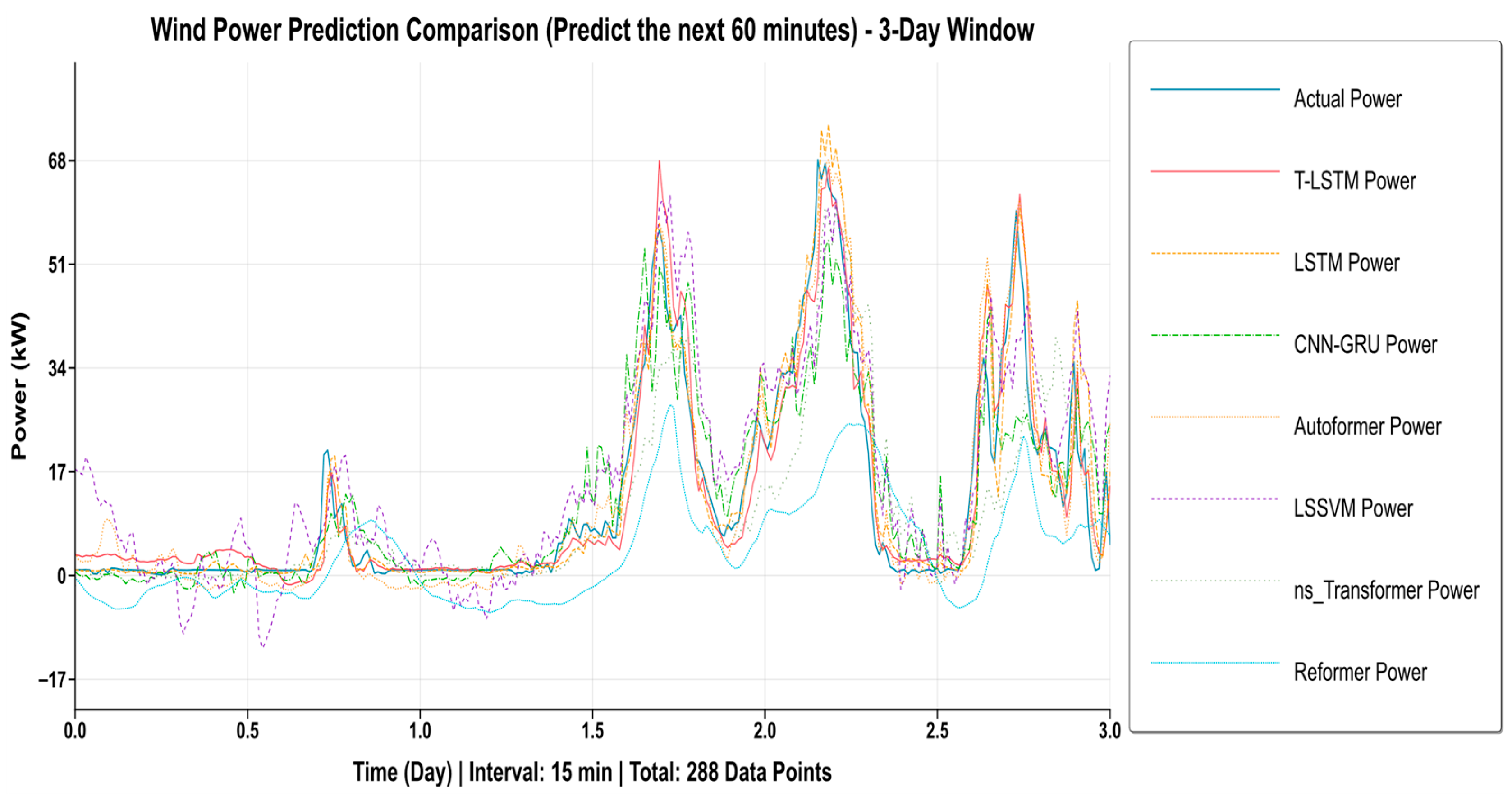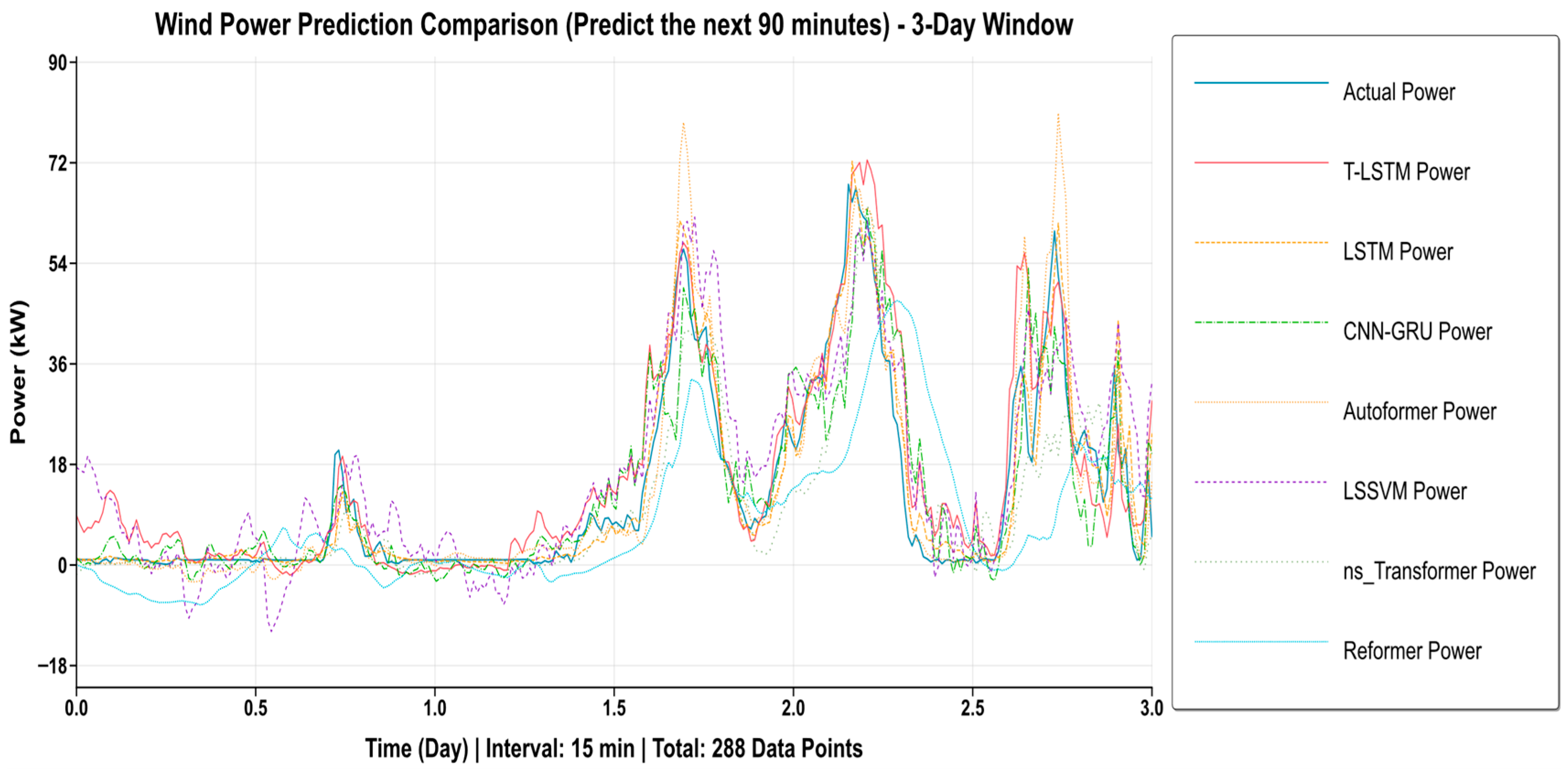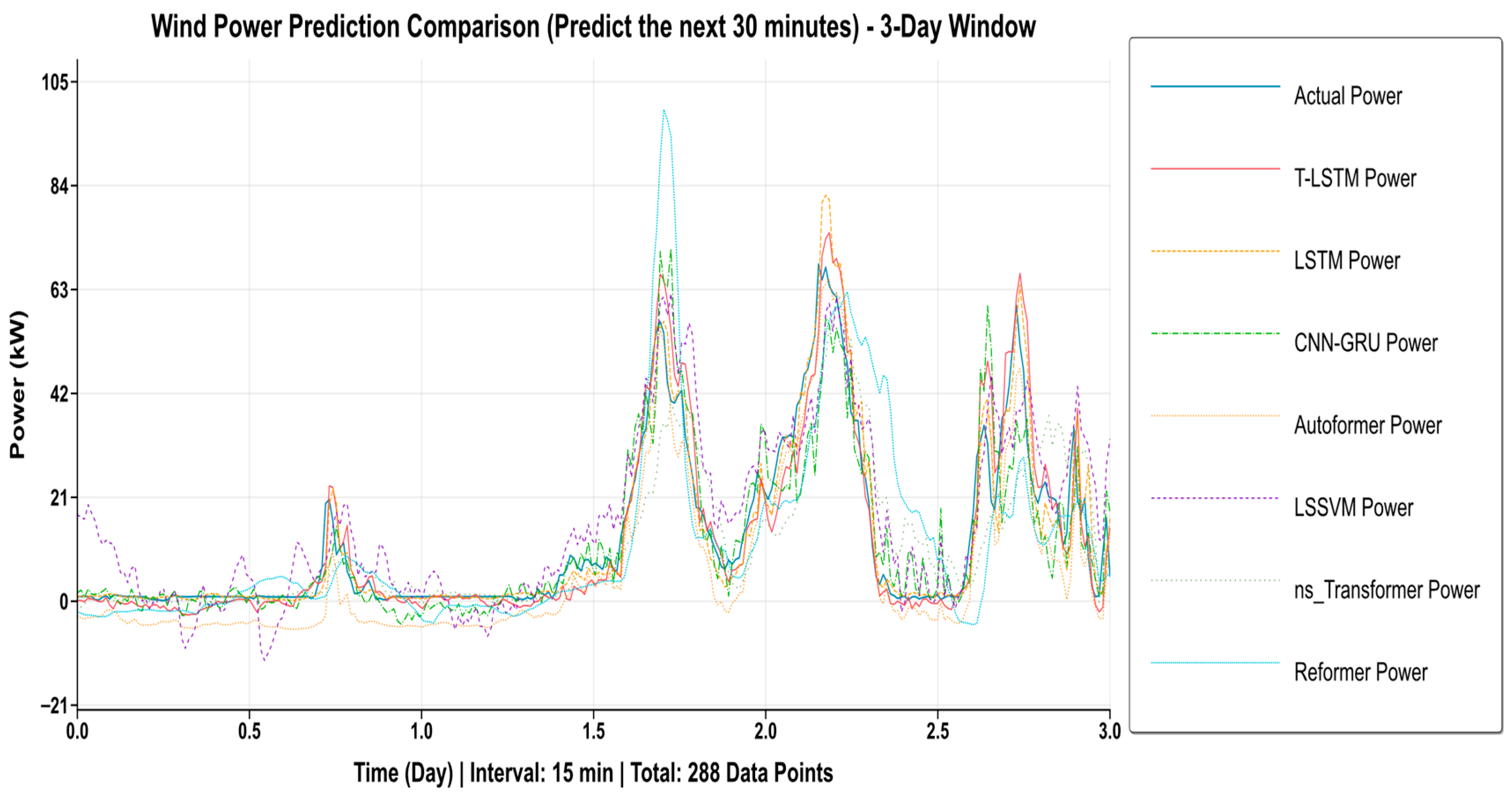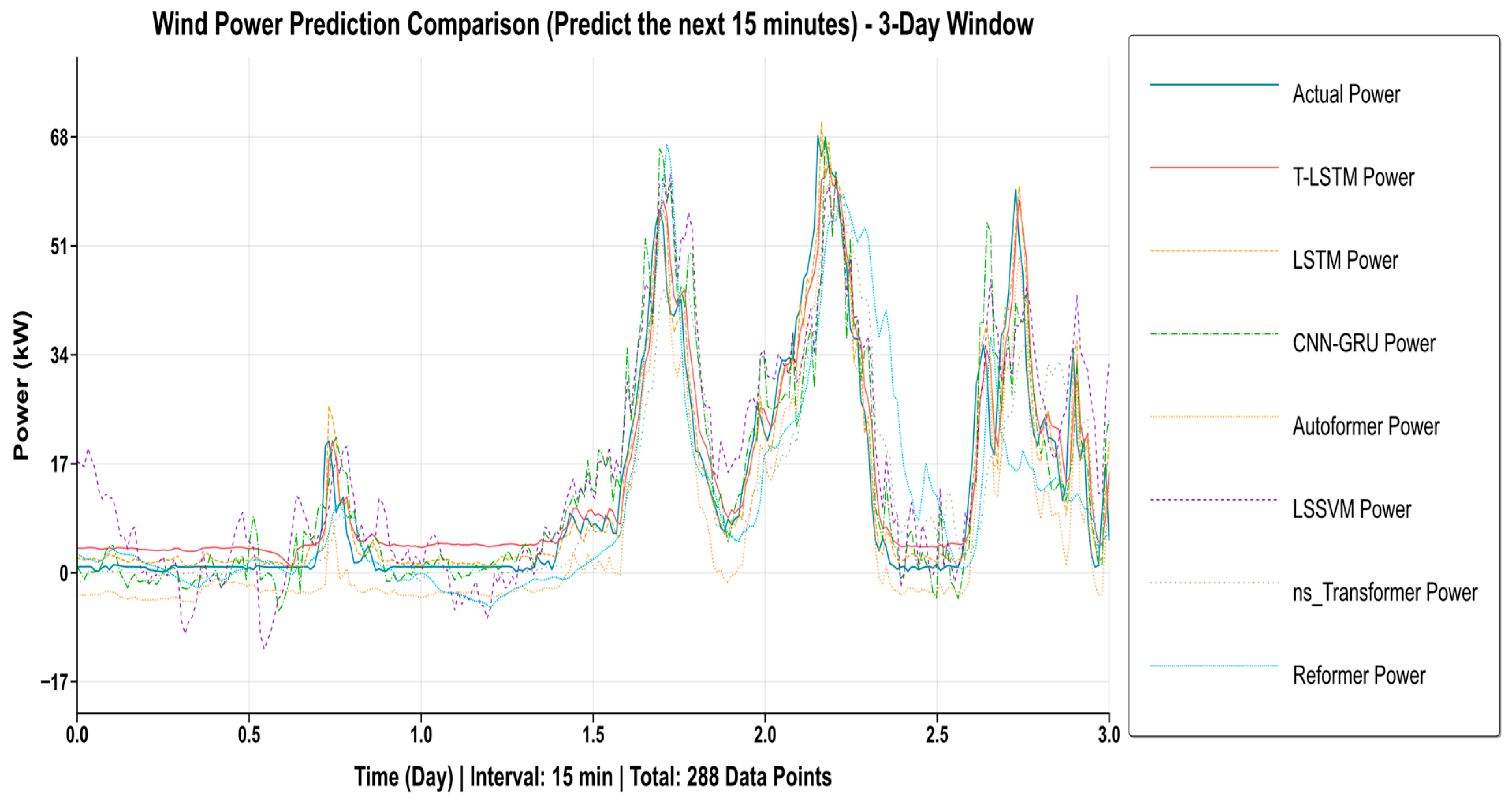 Figure 12. These numbers display the actual wind power values and predicted power values of different models, including T-LSTM, LSTM, GRU, Autoformer, Reformer, LSSVM, and ns_Transformer. The selected 3-day period (Days 10–12) is representative of typical wind power characteristics: it includes stable low-fluctuation phases, sudden power surges/drops, and extreme peak values, reflecting the model’s adaptability to diverse scenarios.