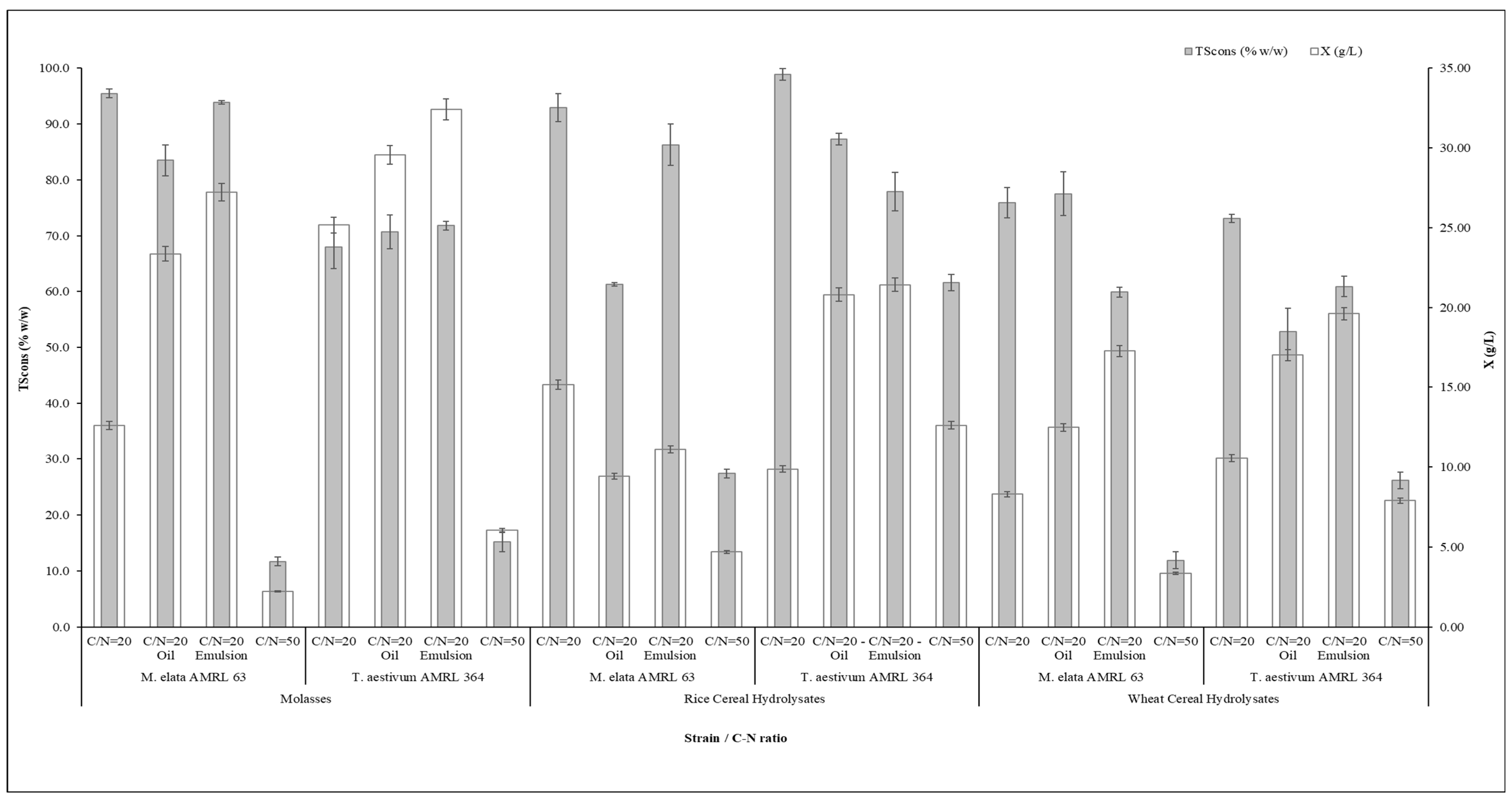 | Strain | C/N | Condition | Substrate | C16:0 | Δ9C16:1 | C18:0 | Δ9C18:1 | Δ9,12C18:2 | Δ9,12,15C18:3 | U.I. |