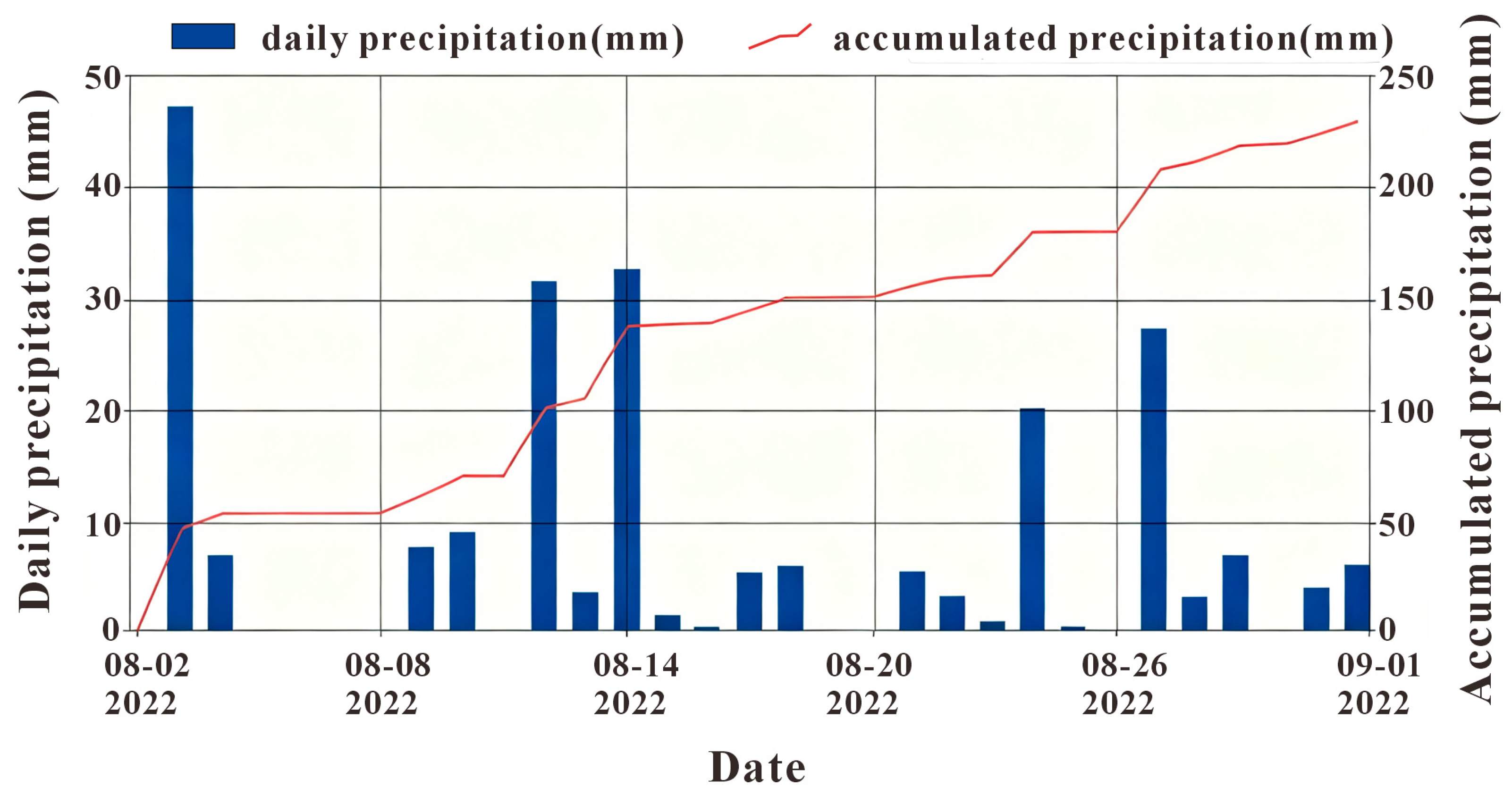 - Chen, G.; Meng, X.; Qiao, L.; Zhang, Y.; Wang, S. Response of a Loess Landslide to Rainfall: Observations from a Field Artificial Rainfall Experiment in Bailong River Basin, China. Landslides 2018, 15, 895–911. [Google Scholar] [CrossRef]