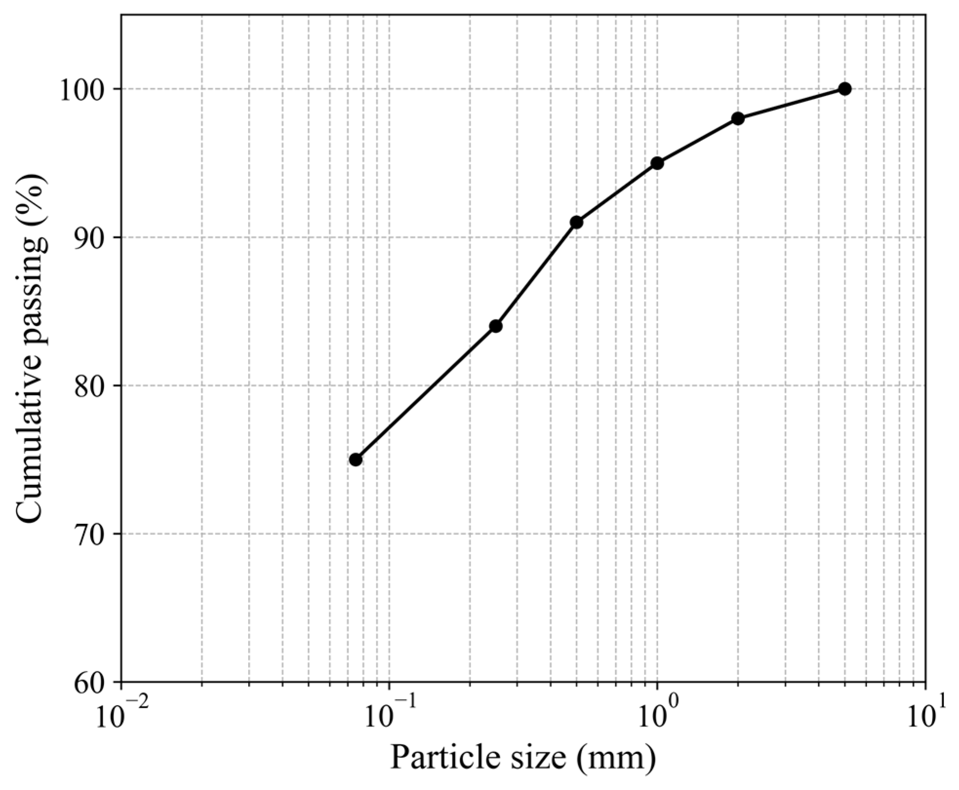 | Material | Specific Gravity | Natural Moisture Content (%) | Dry Density (g·cm−3) | Liquid Limit (%) | Plastic Limit (%) | Coefficient of Permeability (cm/s) | Cohesion (kPa) | Internal Friction Angle (°) |