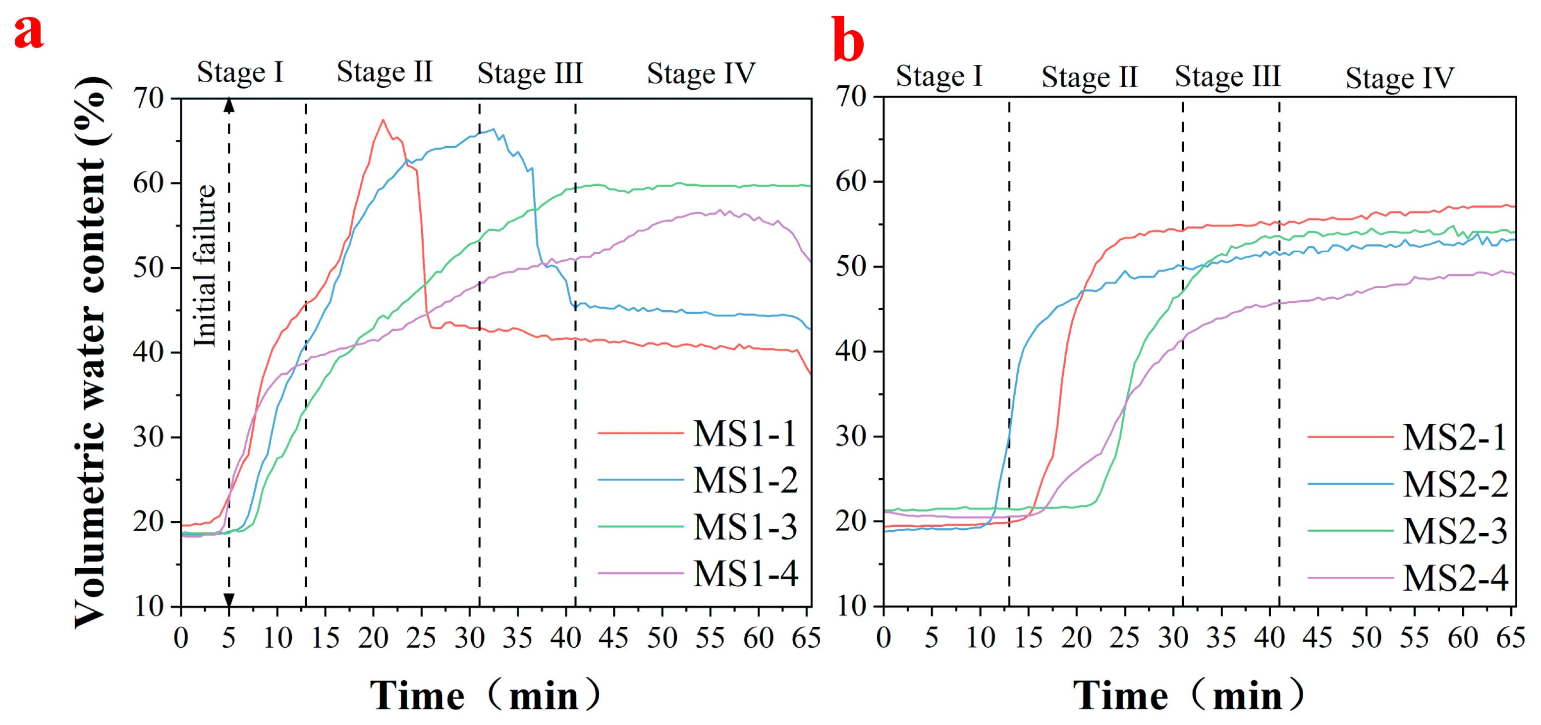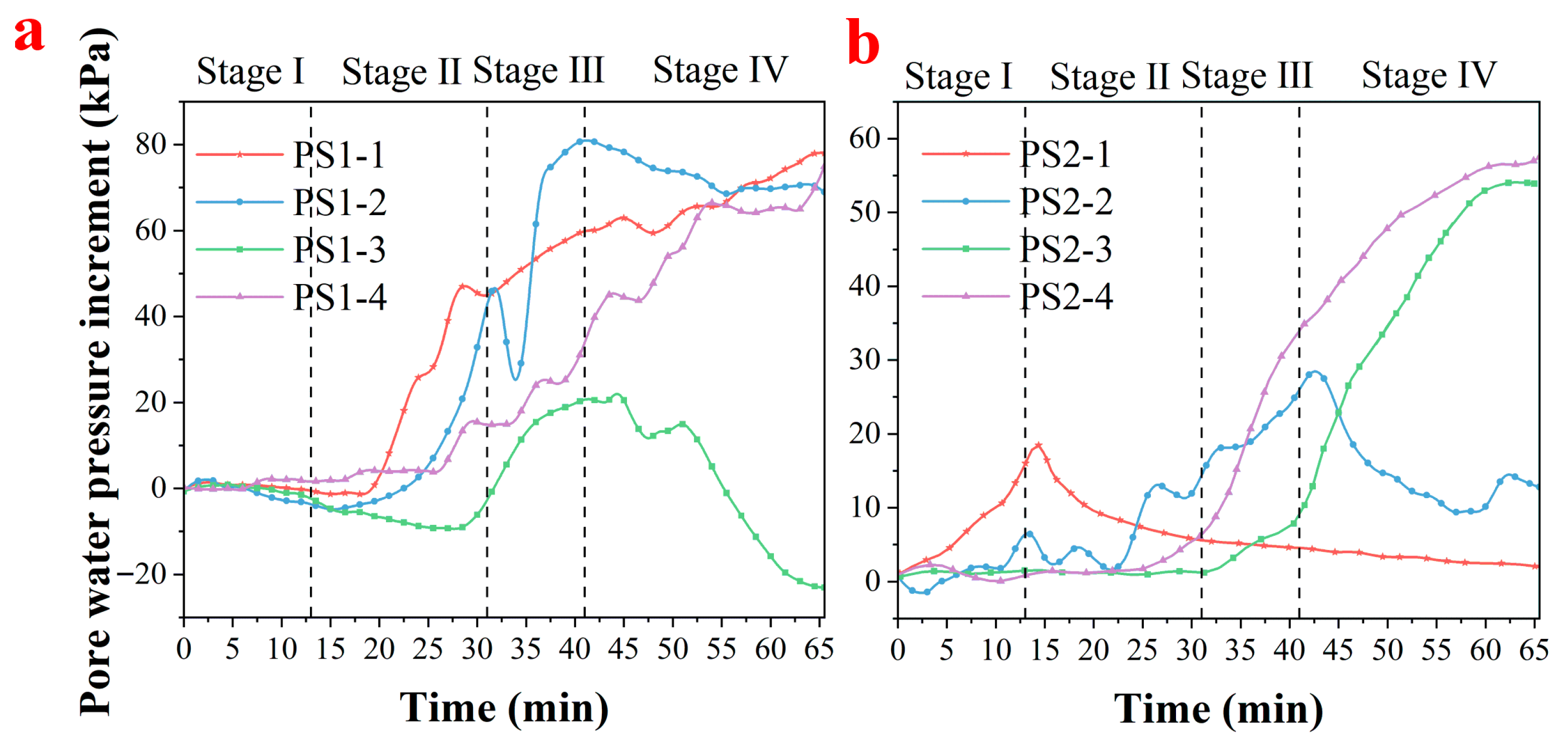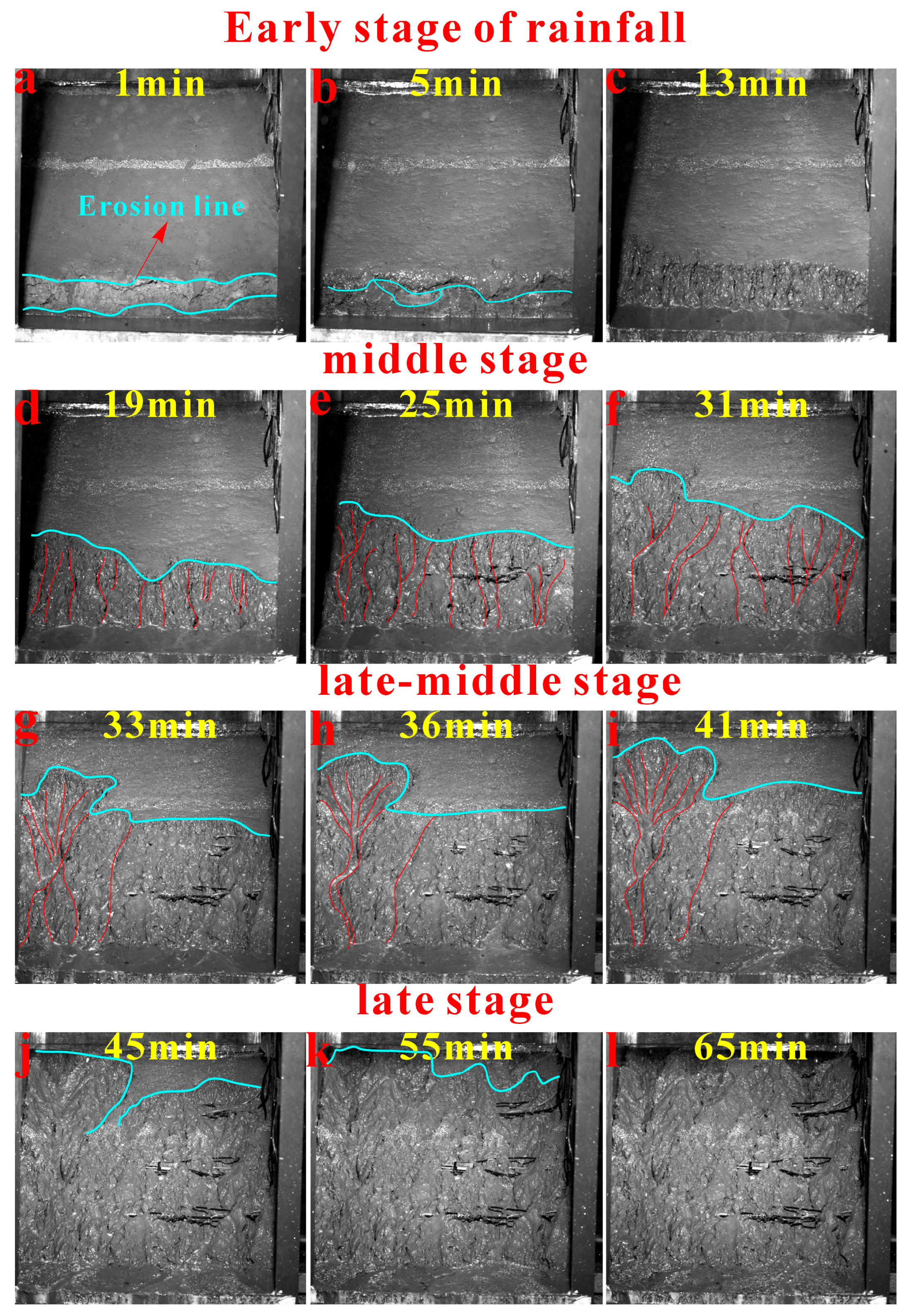- During the late stage of rainfall (41–65 min), the prefabricated fissures at the slope crest acted as preferential seepage channels. With continued infiltration and deepening front-edge erosion, the erosion line eventually reached the crest, leading to complete surface failure (Figure 8j). During 55–65 min of rainfall, as the slope had already failed entirely, only small-scale and frequent local sliding occurred (Figure 8k). By the end of rainfall, both the front and rear edges of the slope exhibited significant subsidence and erosion, with the surface soil fluidized and transported downslope, and the overall failure pattern tended to stabilize (Figure 8l).