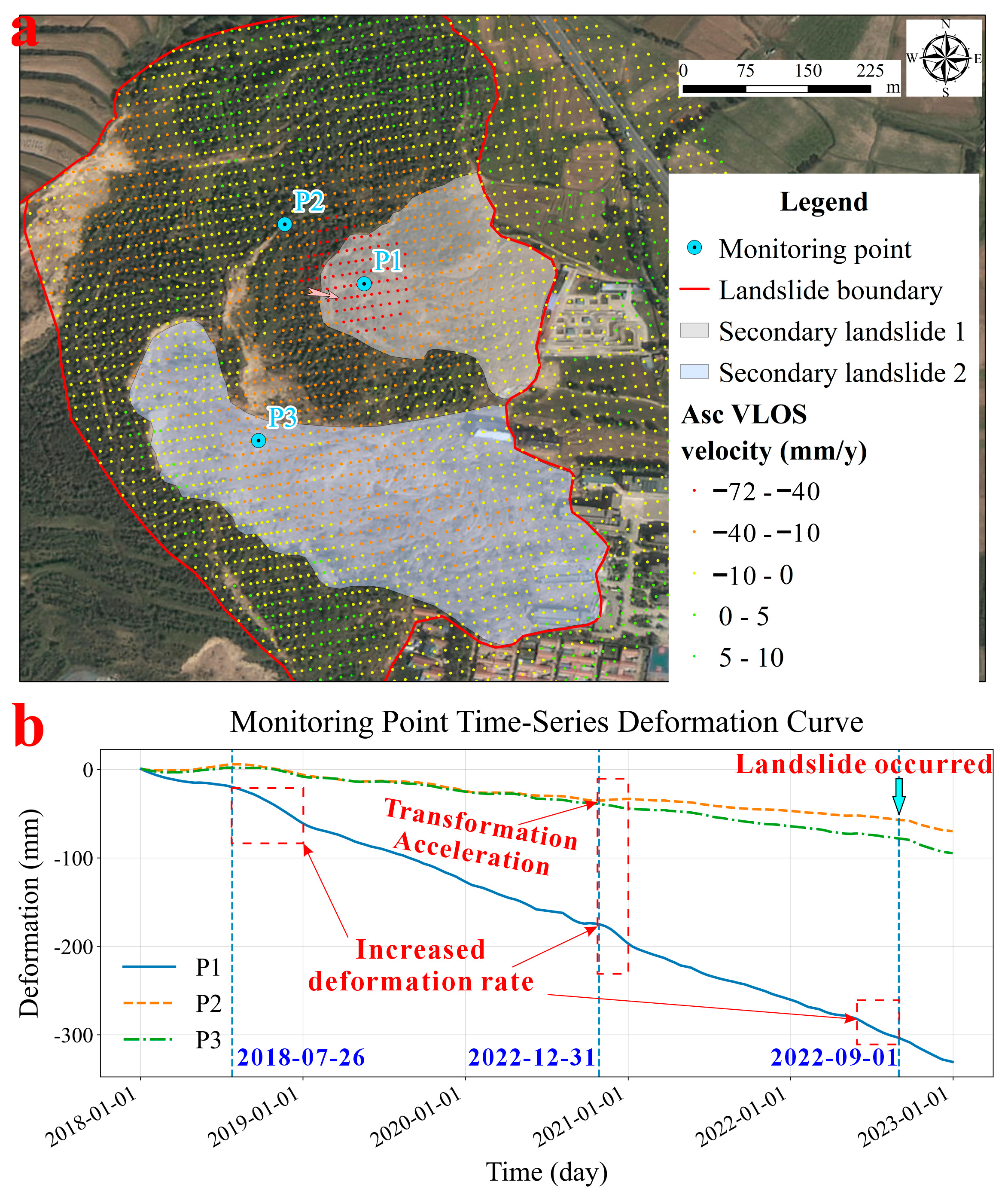 - Liu, M.; Yang, W.; Yang, Y.; Guo, L.; Shi, P. Identify Landslide Precursors from Time Series InSAR Results. Int. J. Disaster Risk Sci. 2023, 14, 963–978. [Google Scholar] [CrossRef]