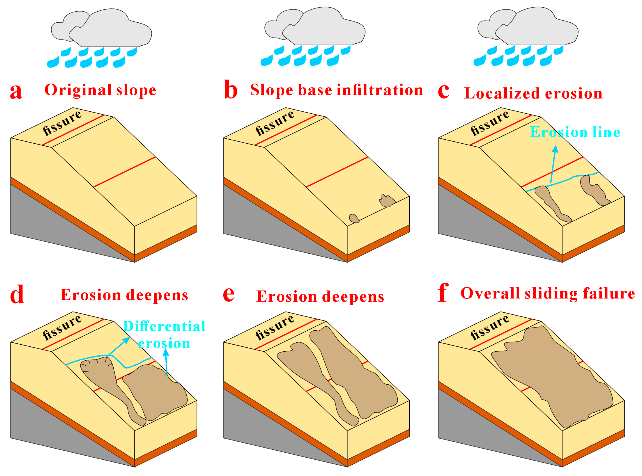 - Liu, X.; Dong, J.; Tang, C.; Pan, Y.; Zhao, J.; Wei, Z. Instability Mechanism of Loess-Mudstone Landslides under Rainfall Infiltration Conditions. Sci. Rep. 2025, 15, 17591. [Google Scholar] [CrossRef]