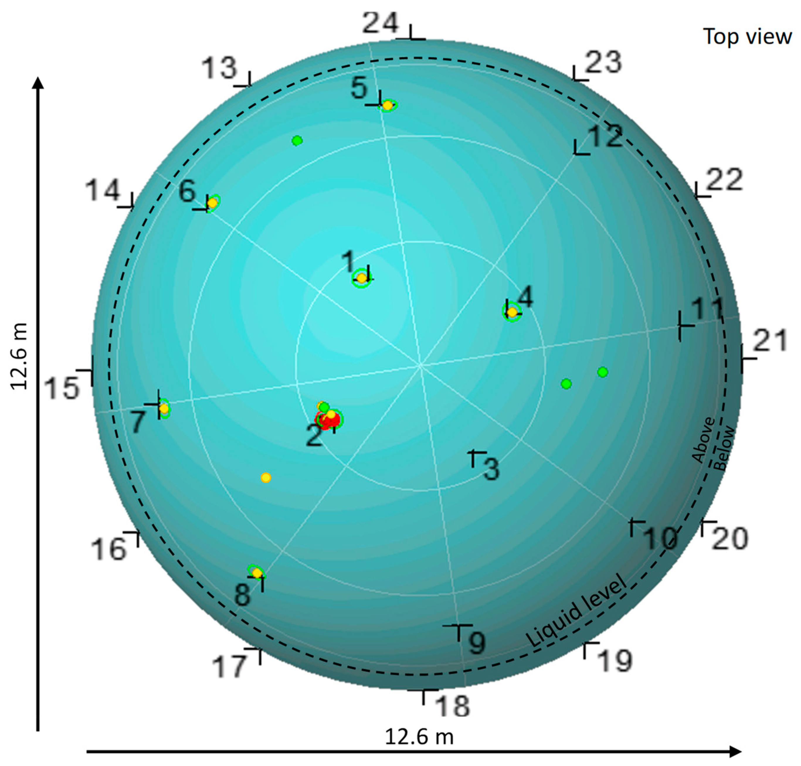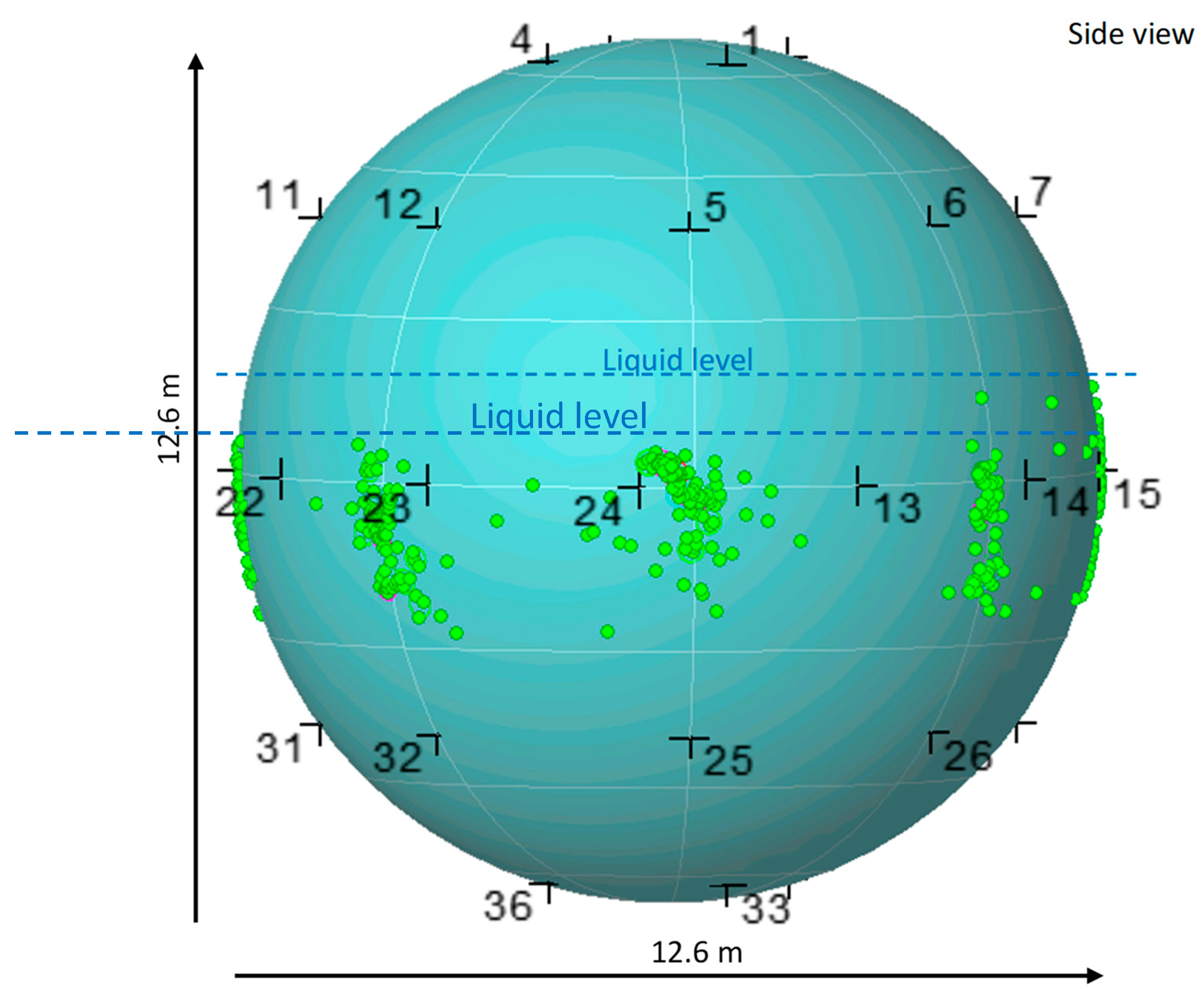 34], a new method was proposed for automatically determining the onset of different Lamb modes based on cross-correlating signals with one of a limited number of manually selected reference wavelets. The performance of this method applied to a dataset recorded on a stainless-steel plate in a laboratory environment was promising. However, its applicability in an industrial setting was not investigated. Therefore, in this study, the results of using a similar method for automatic determination of the arrival times of wave modes are presented for an industrial gas storage sphere. The application of the method to a sphere introduces additional challenges. Firstly, larger propagation distances are possible and the distances between sensors are considerably larger than on a lab plate. Secondly, some of the sensors of which the signals are considered are placed above the liquid phase level in the sphere whereas others are below. Finally, for natural sources, the exact source positions are unknown. To account for these challenges, the method was adapted in order to enable analysis of a dataset collected on site from an industrial spherical gas storage tank.