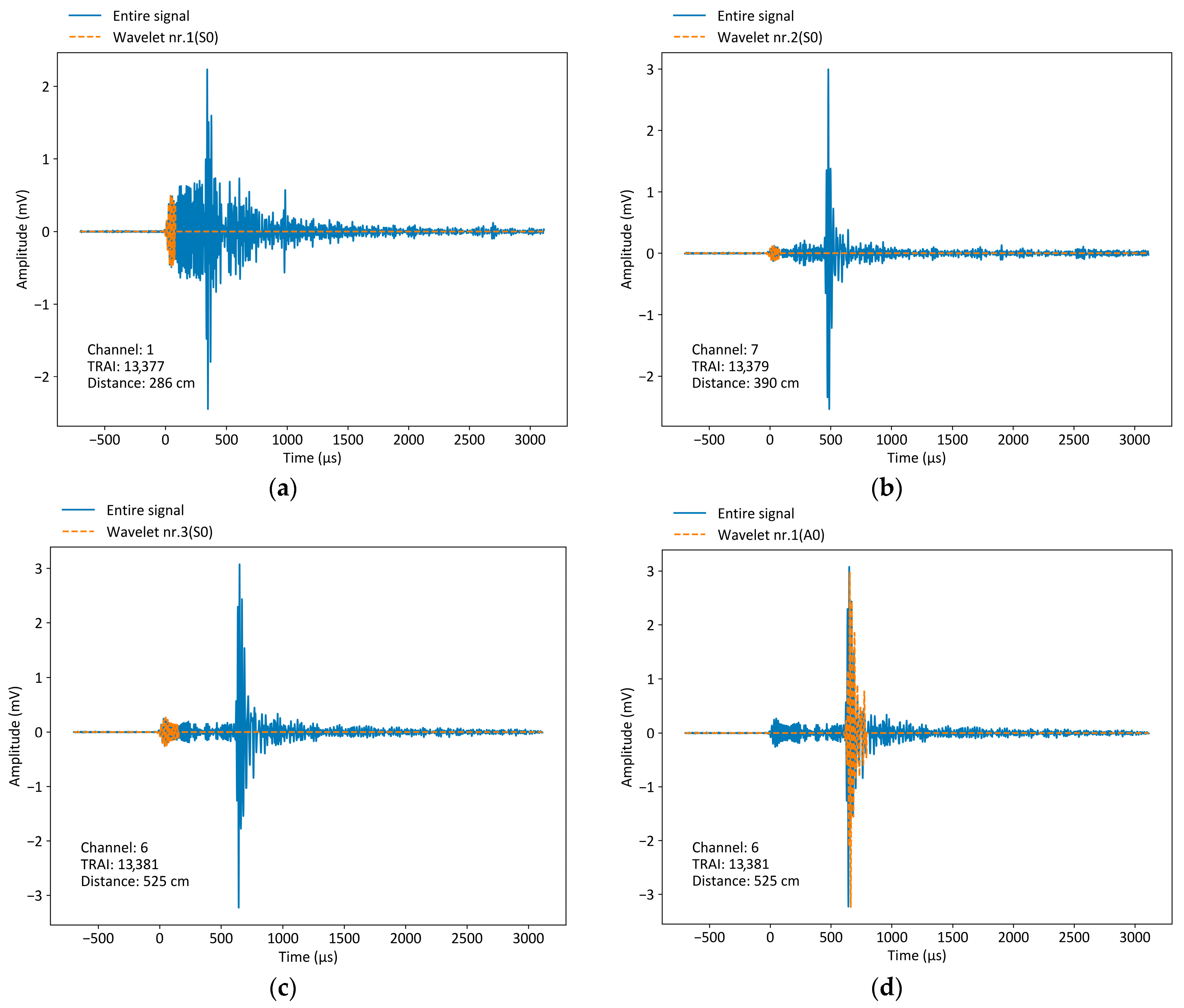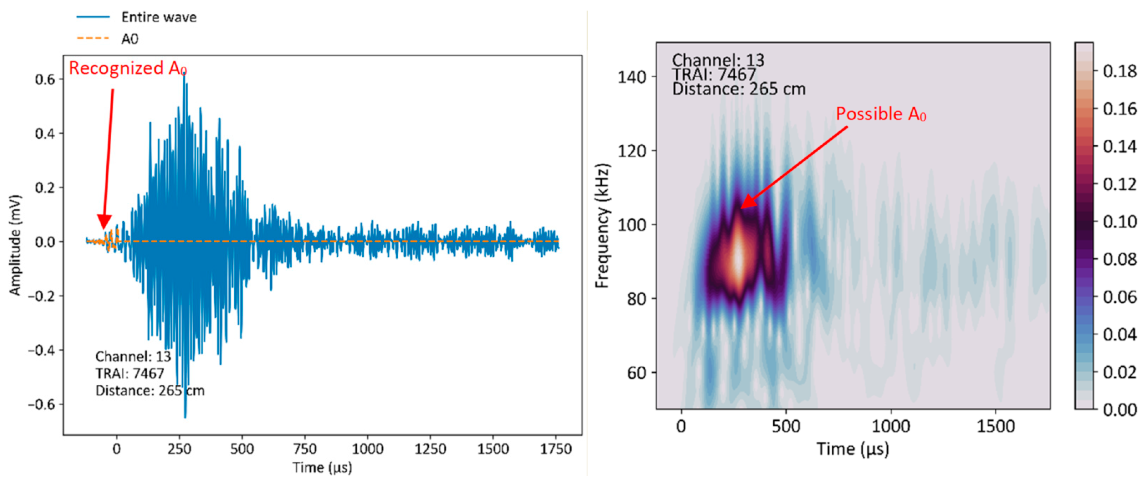 Future work on the method applied in this work should focus both on its performance and its applicability to a broader range of tested objects. Currently, the wave modes are recognized independently from each other. An aspect that is currently not used is the time difference between different modes in the same signal. Taking the time difference between different modes into account might improve performance whenever both modes are reliably visible in the signals. The method applied in this work takes the increasing effect of dispersion into account based on different reference wavelets. For each signal, a distance estimate is used to select a reference wavelet. Application of this method to anisotropic materials might therefore require an extended set of reference wavelets and a more elaborated criterion for wavelet selection. Similar challenges may arise when applying this method to objects with more complex geometries since the propagation distance may no longer be sufficient to determine the dispersion expected for each signal.