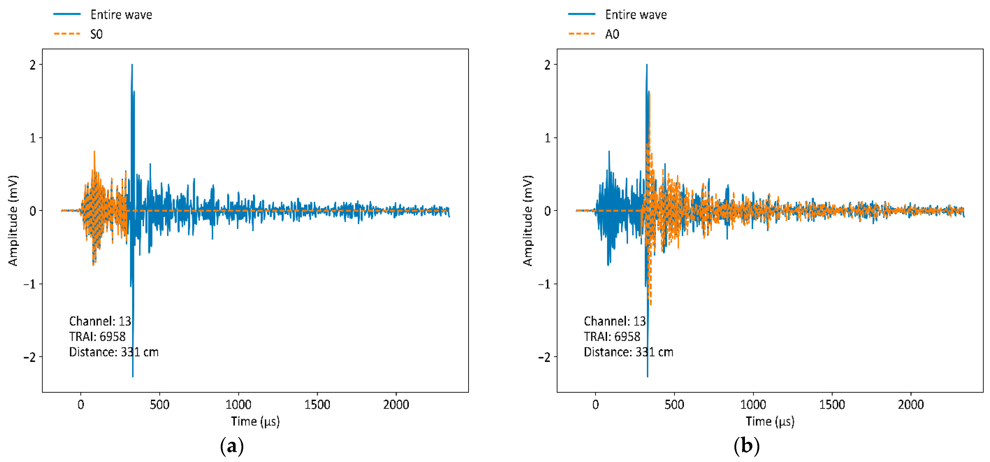 Figure 5b,f. This difference is caused by the band-stop filter that is applied to limit the influence of other modes on the recognition of the A